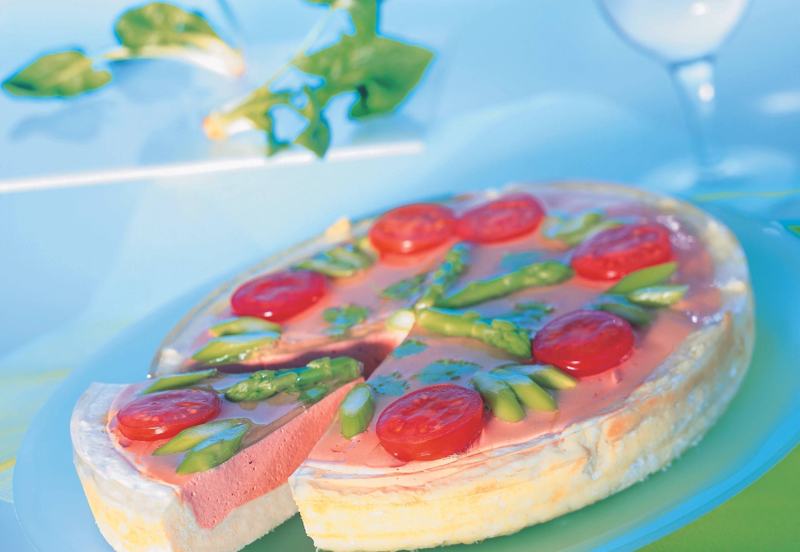 Torte mit Spargel, Paradeisern und Petersilblättern dekorativ belegen und mit Weingelee gleichmäßig einstreichen. Torte nochmals ca. 30 Minuten kühl stellen.