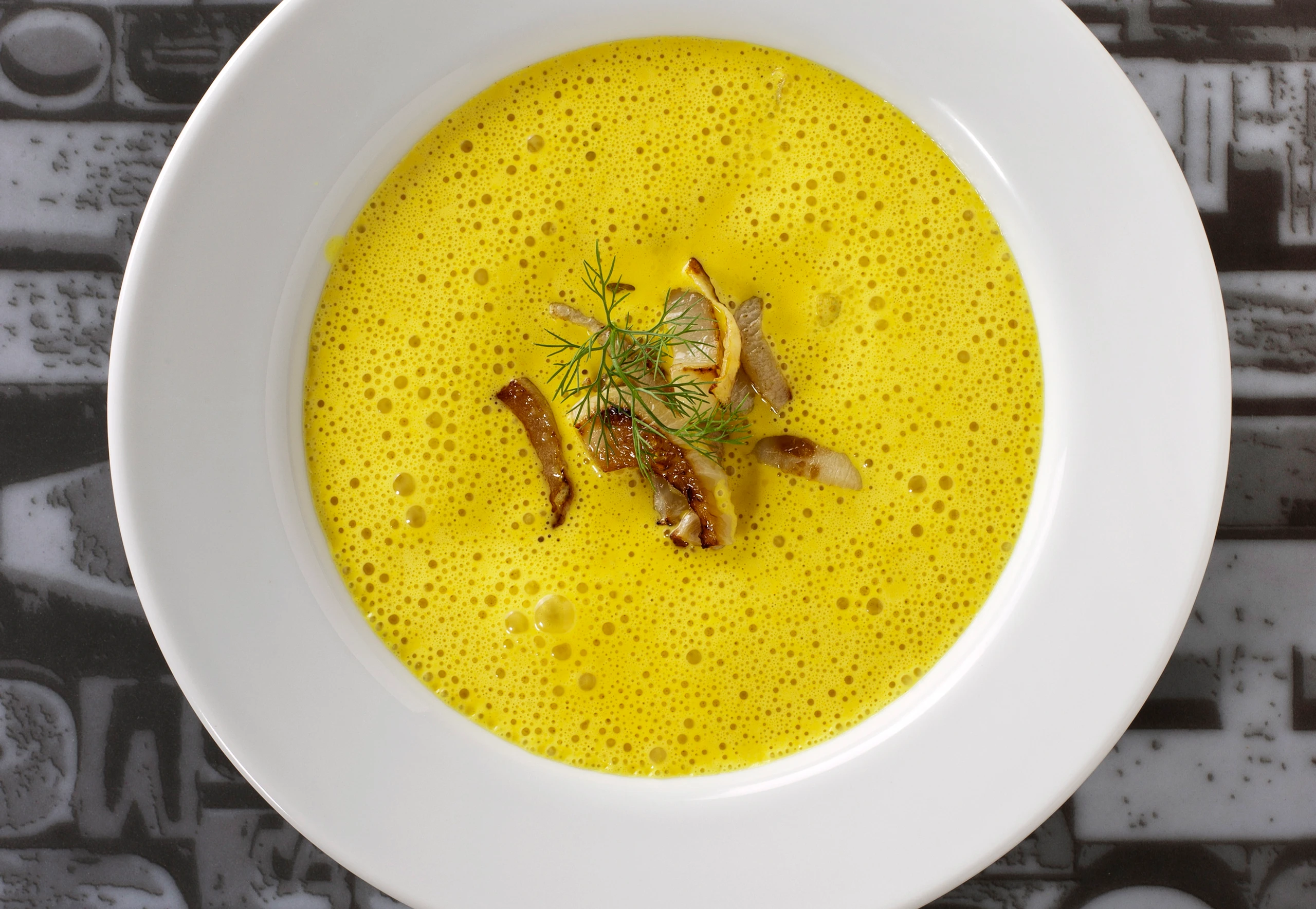 Für die Einlage übrigen Fenchel im Öl goldbraun braten, mit Salz und Pfeffer würzen. Lorbeer entfernen, Suppe fein pürieren und eventuell nachwürzen. Suppe mit der Einlage anrichten und mit dem Fenchelgrün garniert servieren.