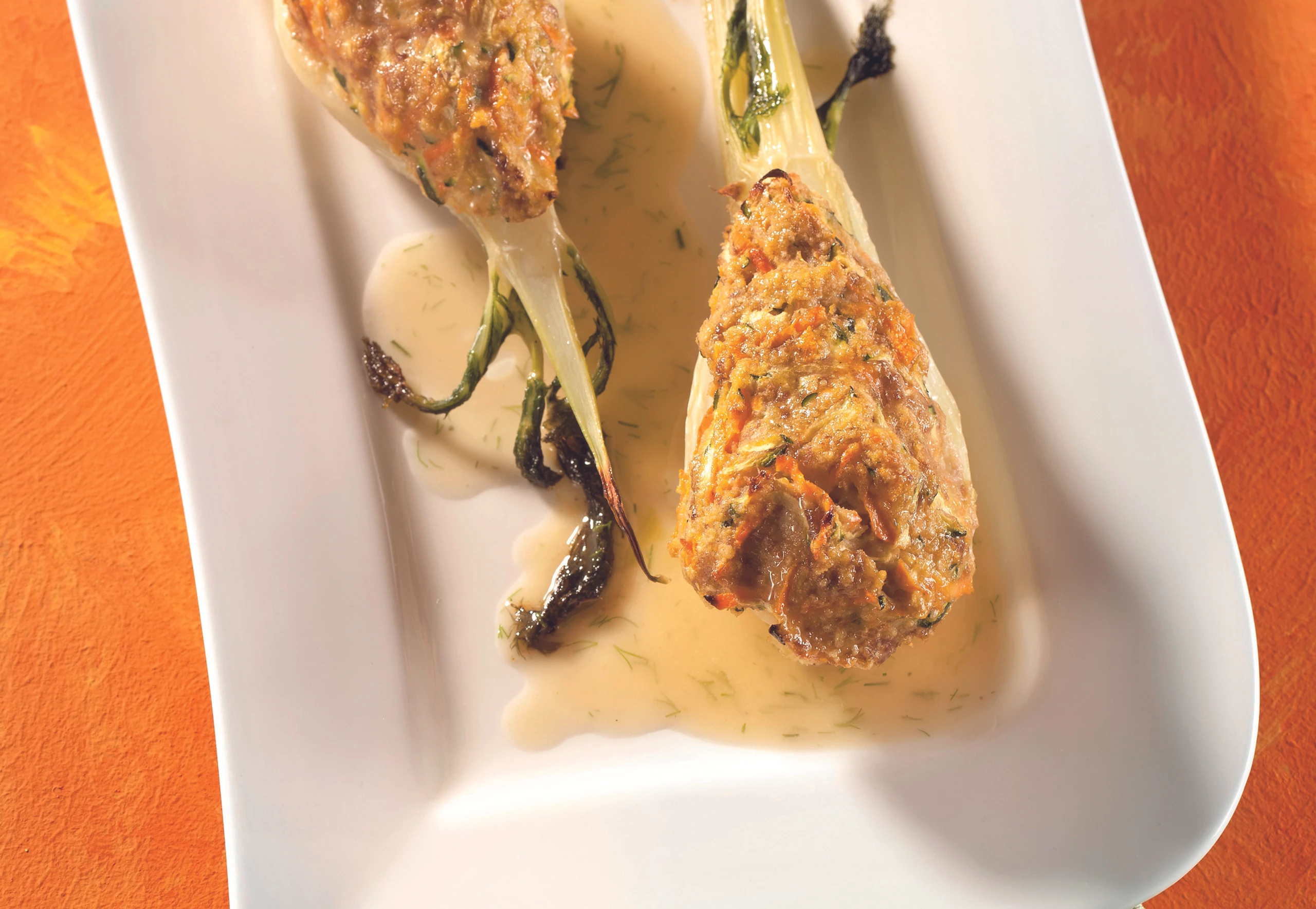 Das zarte Fenchelgrün abzupfen und hacken. Fenchel putzen, schälen und längs halbieren. In Salzwasser 12 Minuten köcheln, herausheben, abschrecken und trockentupfen. Strunk ausschneiden.