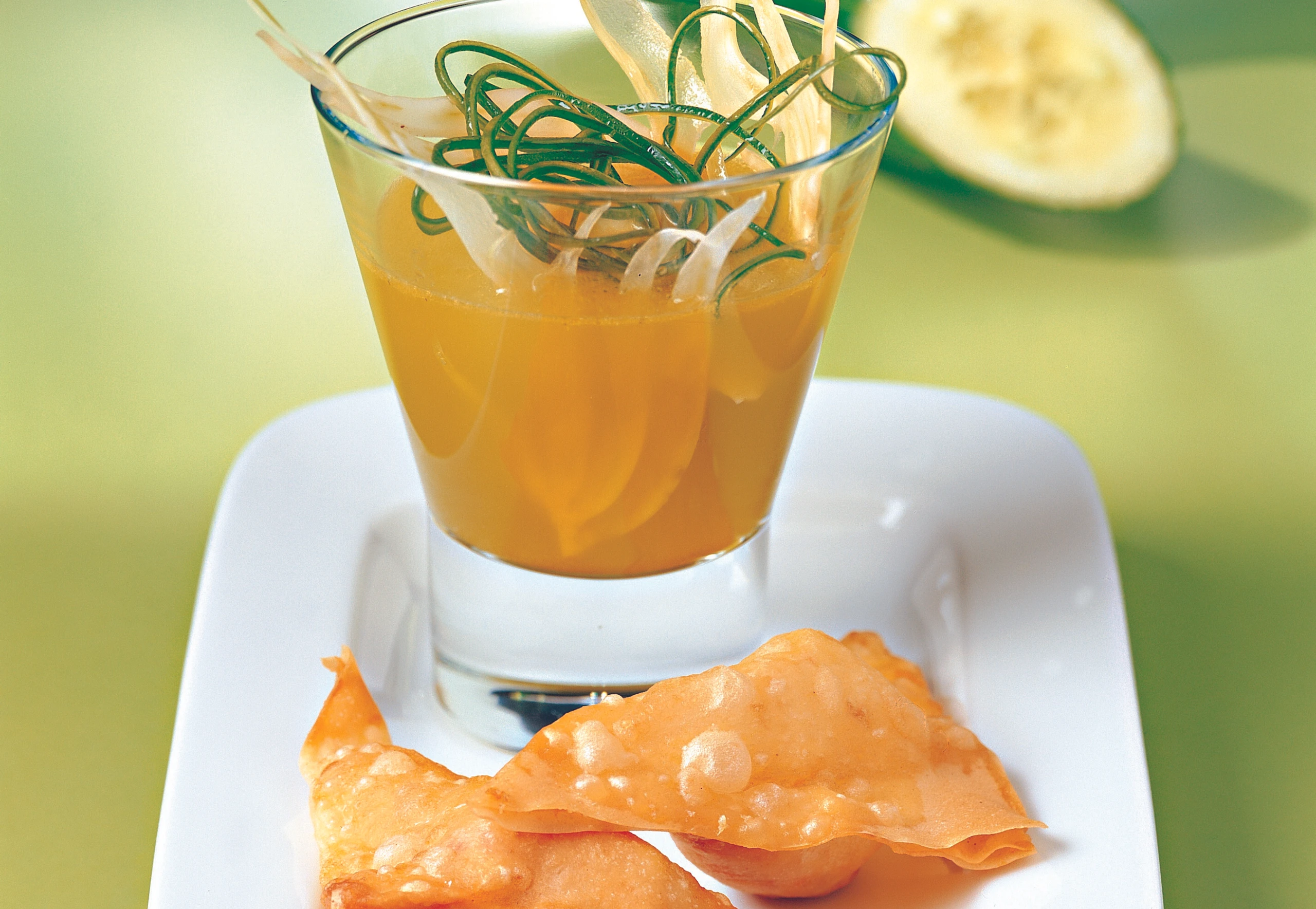 Fenchel-Gurken-Consommé mit Lachstascherln