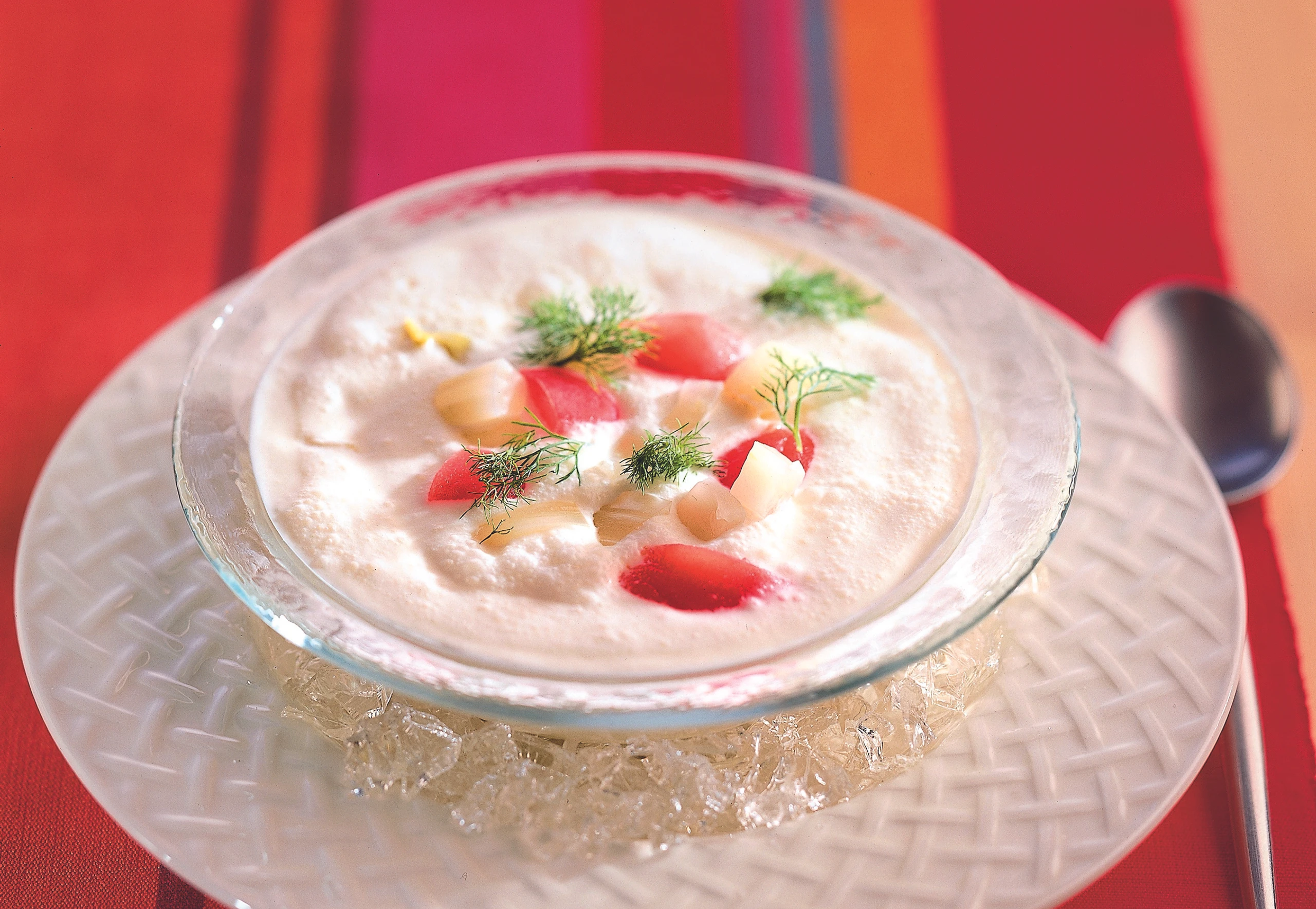 Suppe mit Joghurt verrühren und kräftig durchmixen. Suppe in gekühlten Glasschalen oder Suppentellern anrichten, mit der Einlage und dem Fenchelgrün dekorieren.