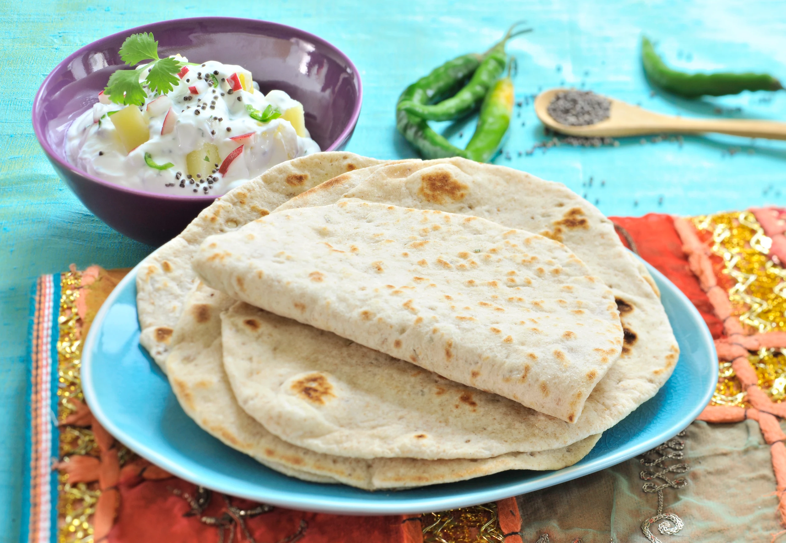 Eine beschichtete oder gusseiserne Pfanne erhitzen. Fladen darin auf beiden Seiten backen, bis sie kleine, hellbraune Punkte bekommen (jeweils ca. 2 Minuten). Fertige Fladen in ein feuchtes Küchentuch einschlagen, damit sie weich bleiben.