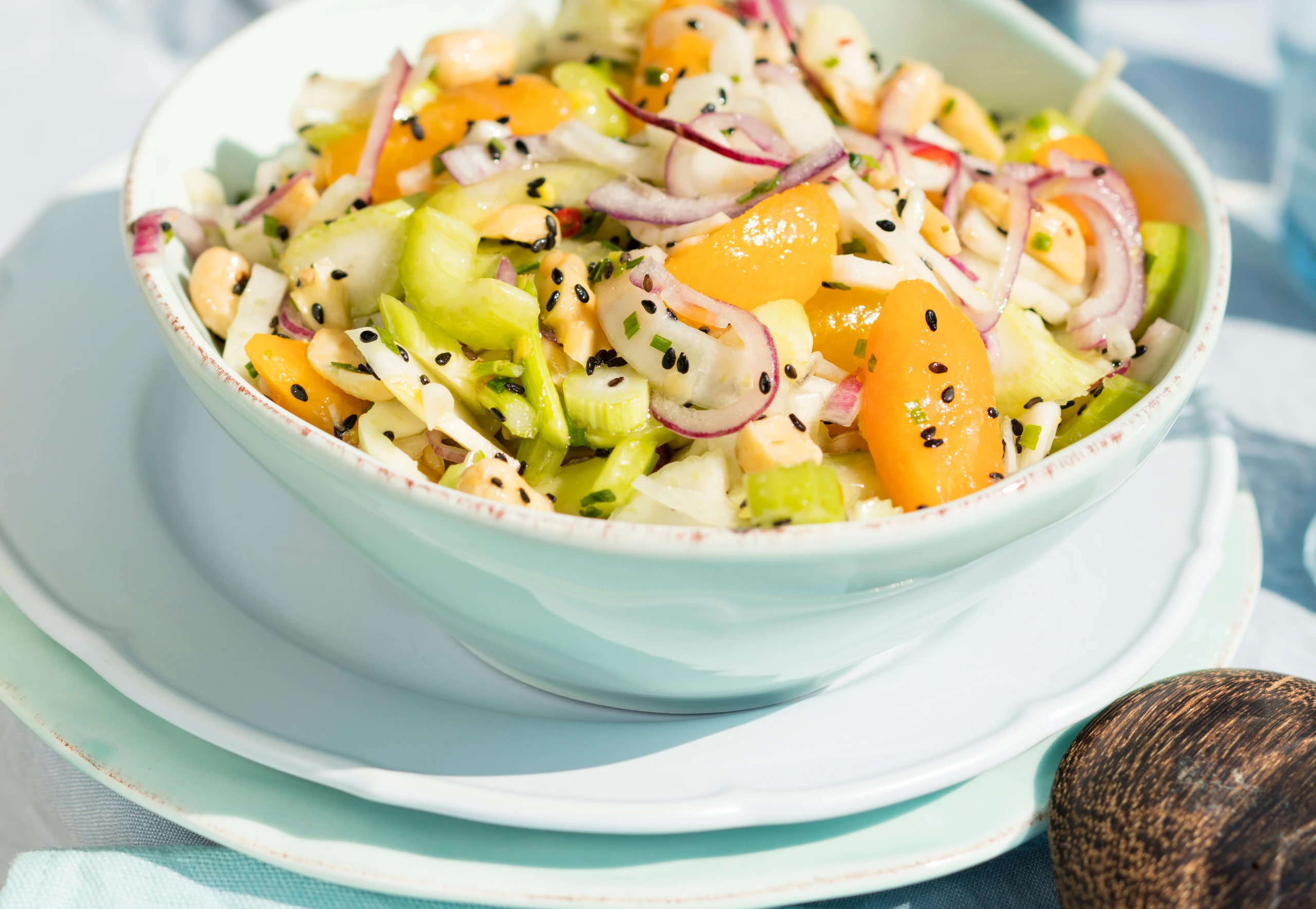 Zwiebeln, Sellerie, Fenchel, Marillen und Cashews mit der Marinade vermischen und kurz ziehen lassen. Salat mit Sesam vermischen und anrichten.