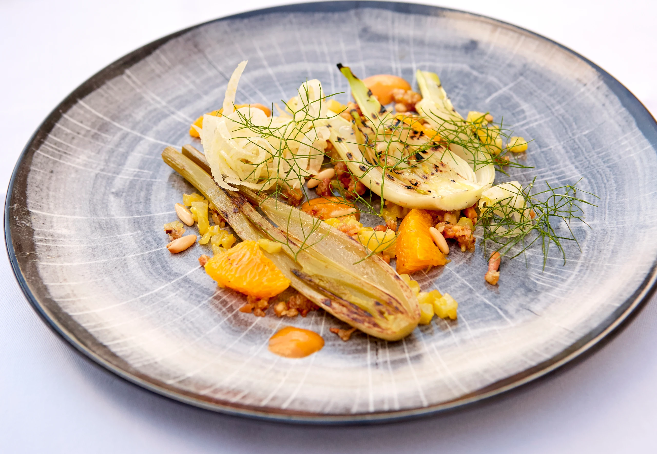 In einem Topf mit Siebeinsatz Späne, Rosmarin und Wacholder schwach erhitzen. Parallel dazu Grillpfanne erhitzen. Die Hälfte vom Fenchel aus Schritt 2 in den Topf legen und ca. 5 Minuten räuchern, übrigen Fenchel auf den Grill legen und garen. Beides mit Salat, Sauce, Ragout und Garnitur anrichten. Mit Fenchelgrün garnieren.