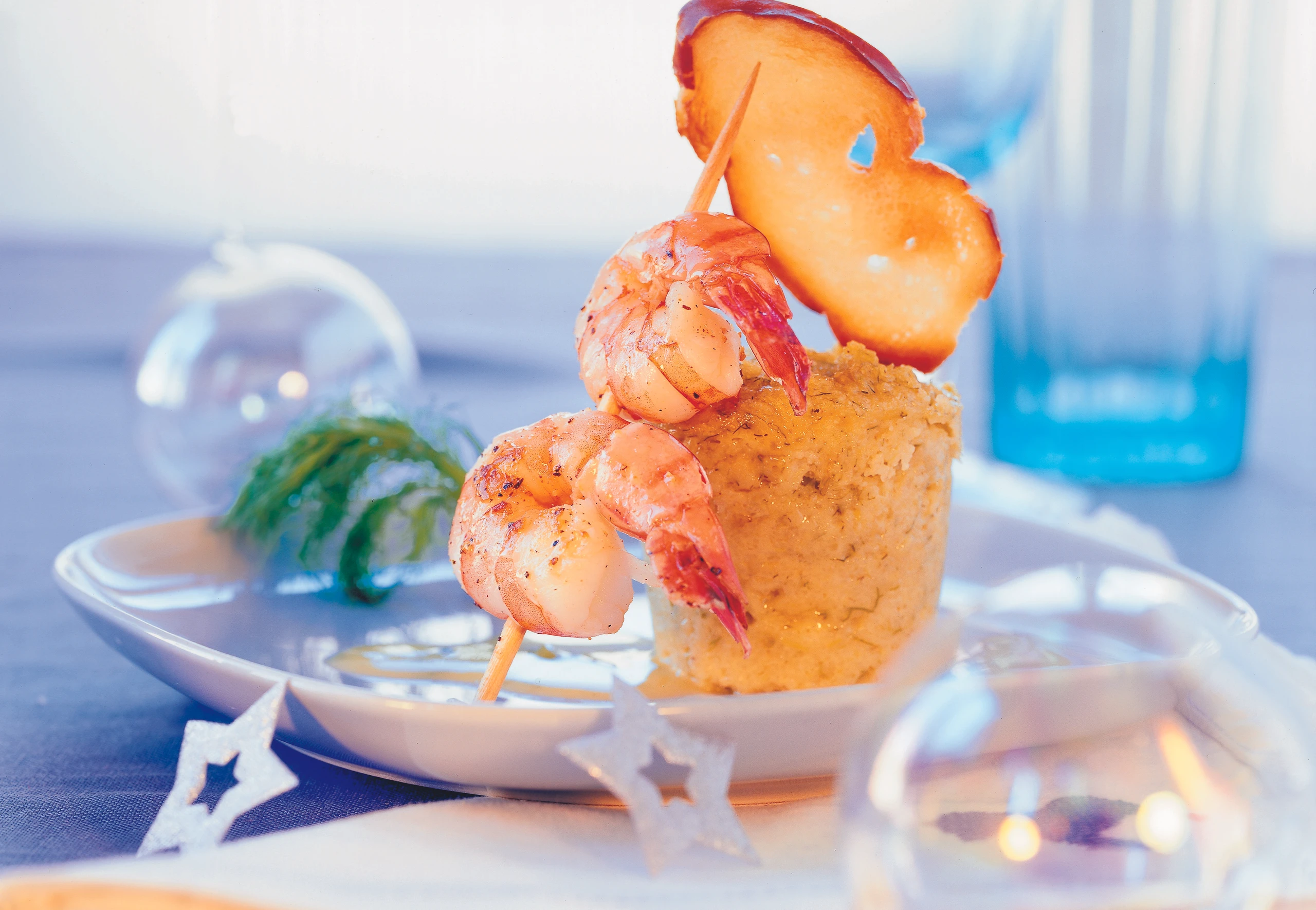 Bratrückstand mit Suppe und Limettensaft ablöschen und aufkochen. Abgeriebene Limettenschale zugeben. Stärke mit 1 EL Wasser vermischen, einrühren und die Sauce aufkochen. Sauce durch Einrühren der Butter binden – nicht mehr kochen. Aufläufe auf Teller stürzen, mit den Garnelenspießen und der Sauce servieren.