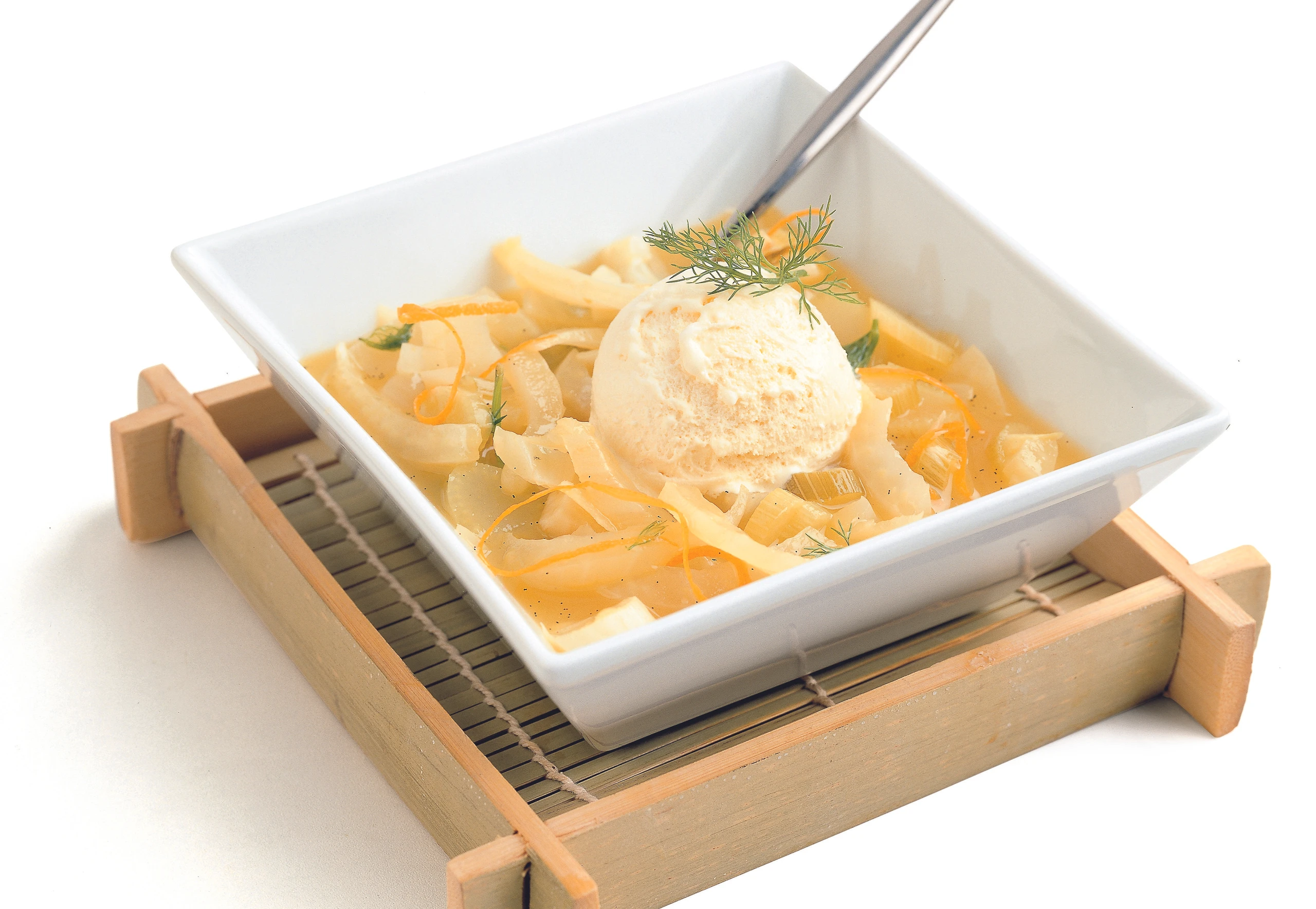 Stärke mit Orangenlikör glatt rühren und in die Fruchtmischung rühren. Kompott vom Herd nehmen, abgeriebene Orangenschale und Fenchelgrün zugeben. Auskühlen lassen und mit dem Eis anrichten.