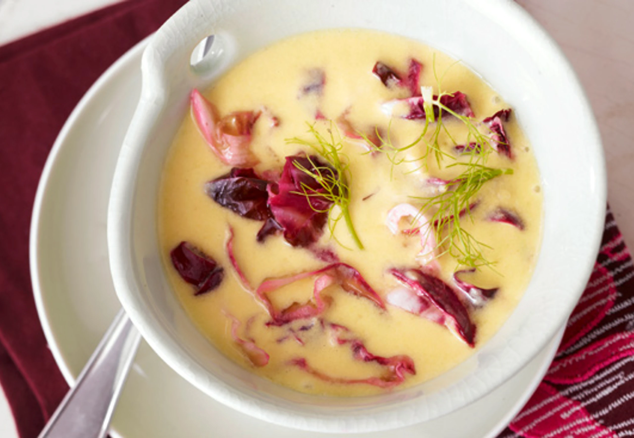Suppe salzen, pfeffern und mit dem Stabmixer pürieren. Radicchio untermischen. Suppe anrichten und mit Fenchelgrün garniert servieren.
