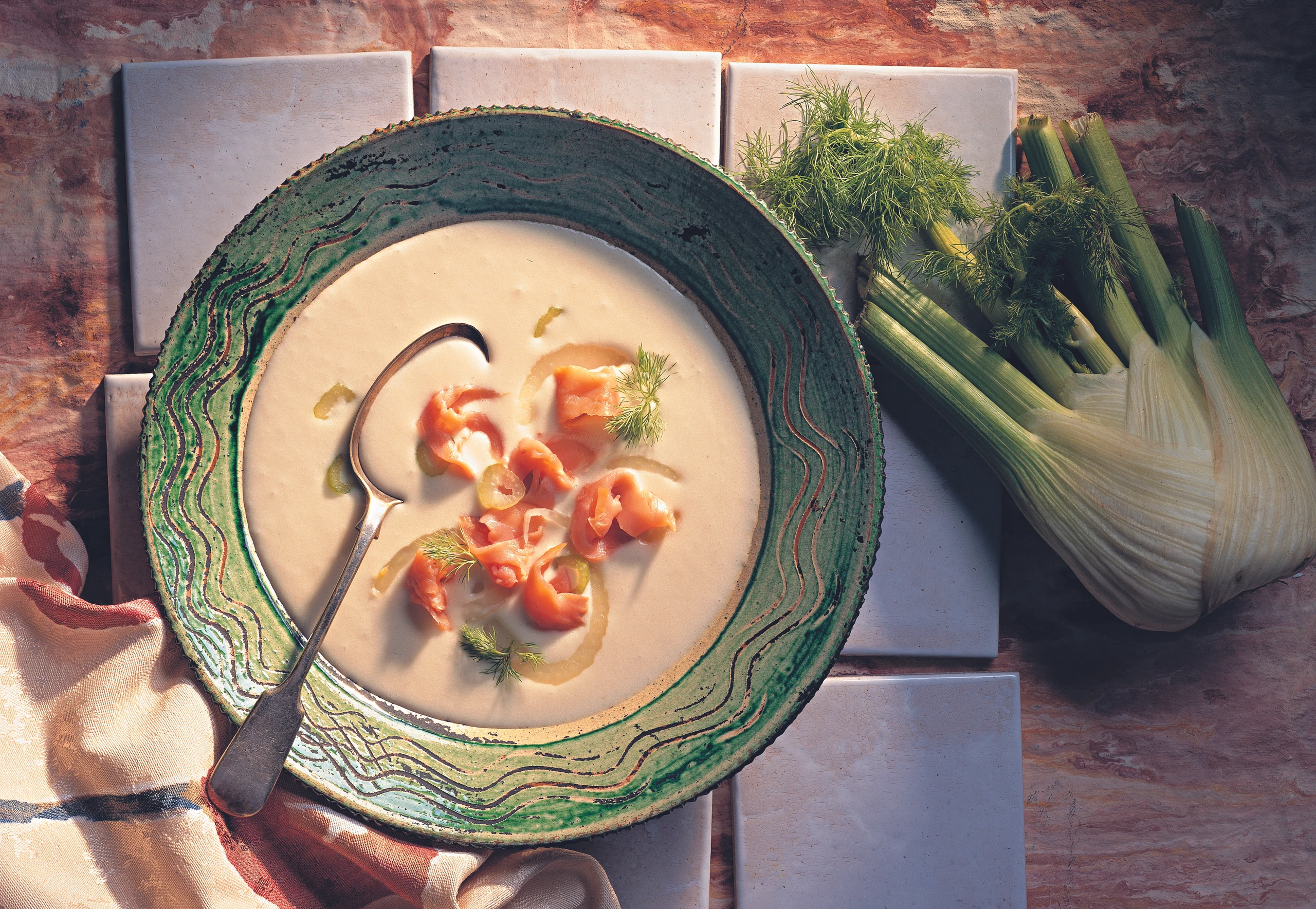 Vor dem Servieren Lachs in nicht zu dünne Streifen schneiden. Suppe kurz mit einem Schneebesen aufrühren, in Teller schöpfen und mit Lachs und Fenchelgrün garniert servieren.