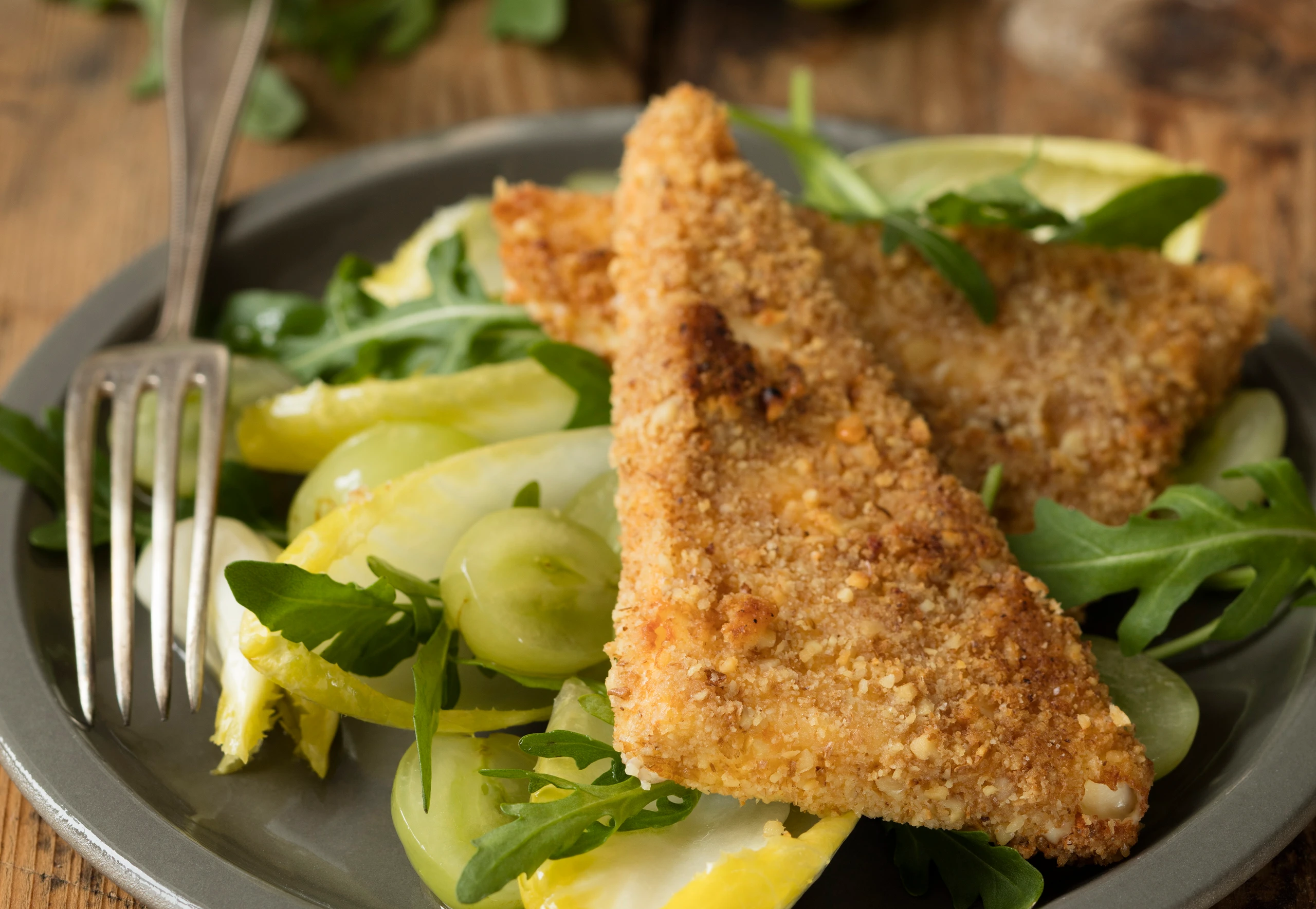 Feta in ca. 2 cm dicke Scheiben schneiden und diagonal halbieren. Feta in Mehl wenden, durch das Ei ziehen und in den Nüssen panieren.