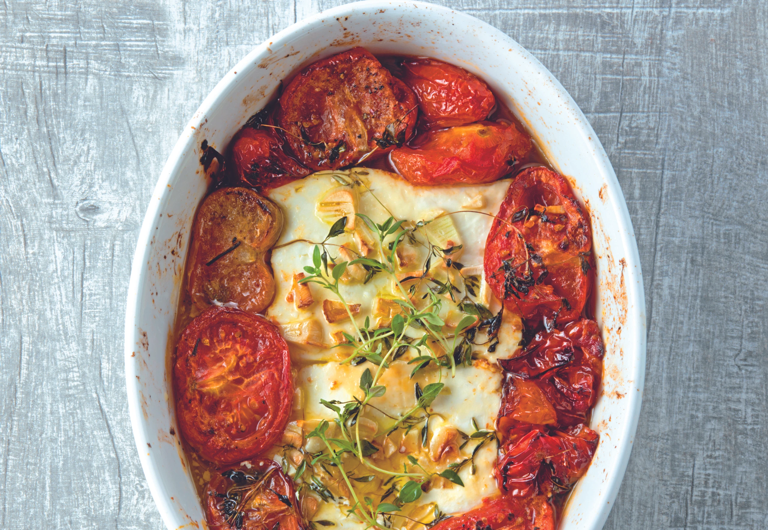 Schafkäse mit Küchenpapier trockentupfen. Knoblauch schälen und grob hacken. Käse in die Mitte der Form legen und mit den Ofenparadeisern umgrenzen. Mit Knoblauch bestreuen, salzen, pfeffern und mit Honig überziehen. Käse mit Thymian belegen, mit übrigem Öl beträufeln und im Rohr (mittlere Schiene / Gitterrost) 30 Minuten backen.