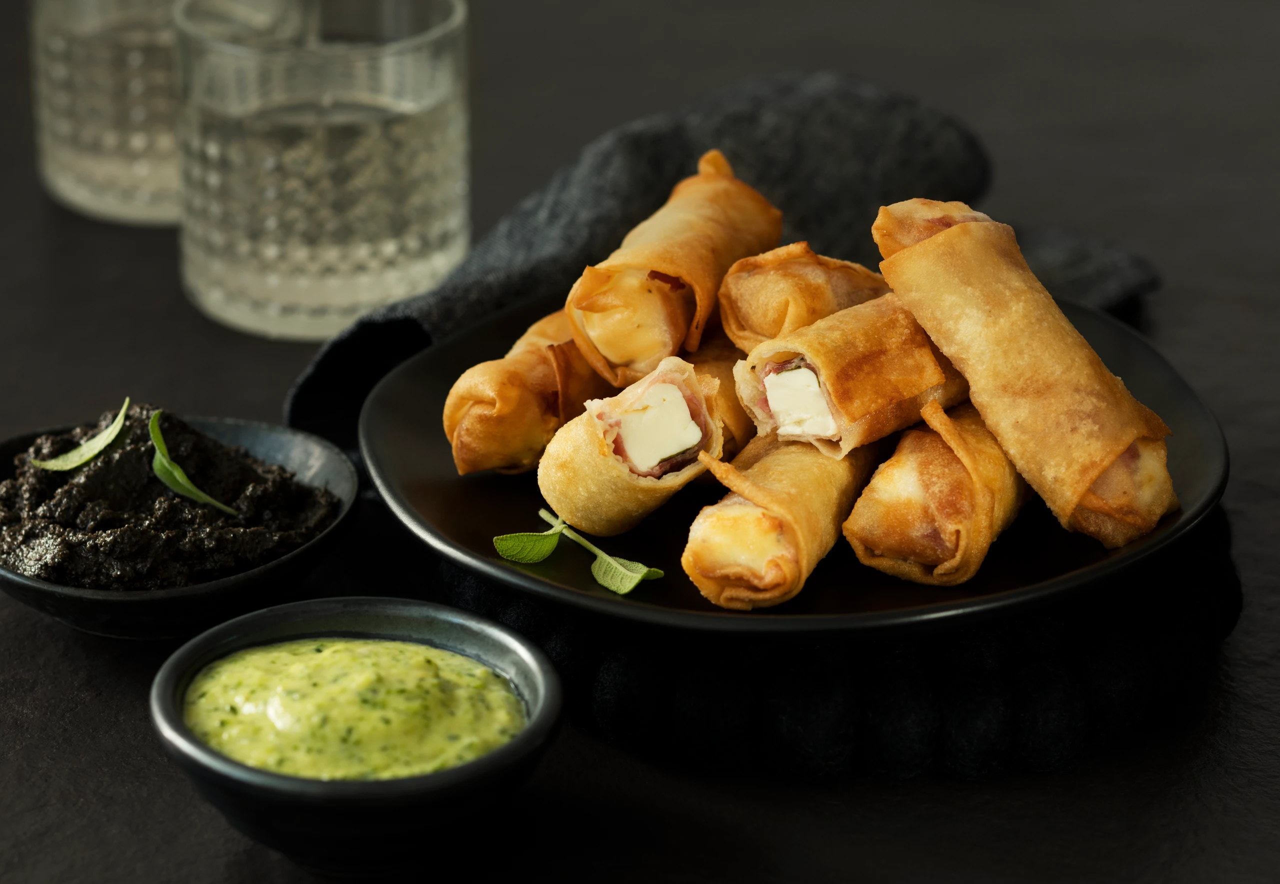 In einem Topf 4 Finger hoch Öl erhitzen, Teigröllchen darin goldgelb backen. Herausnehmen, abtropfen lassen und mit Tapenade und Sauce servieren.