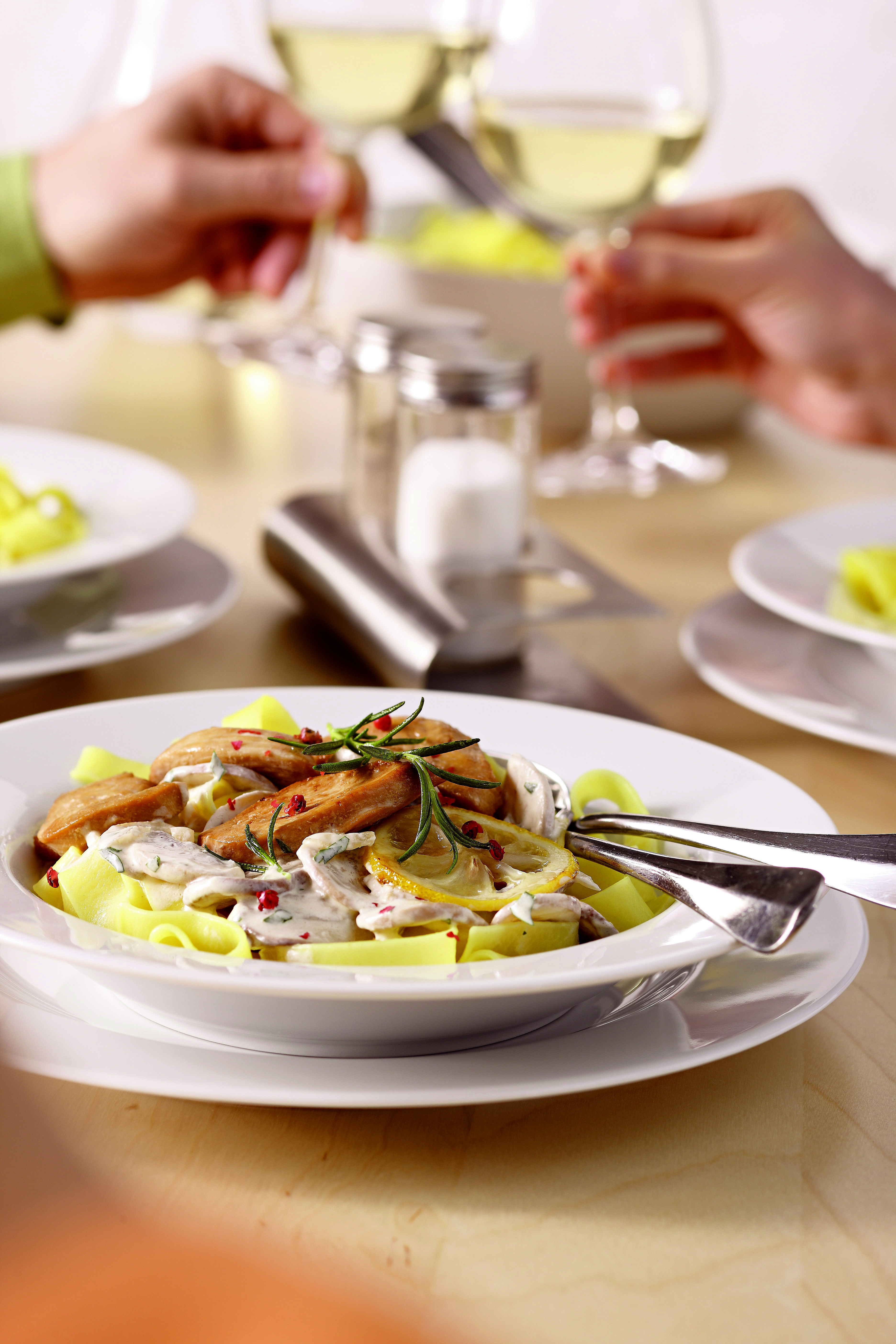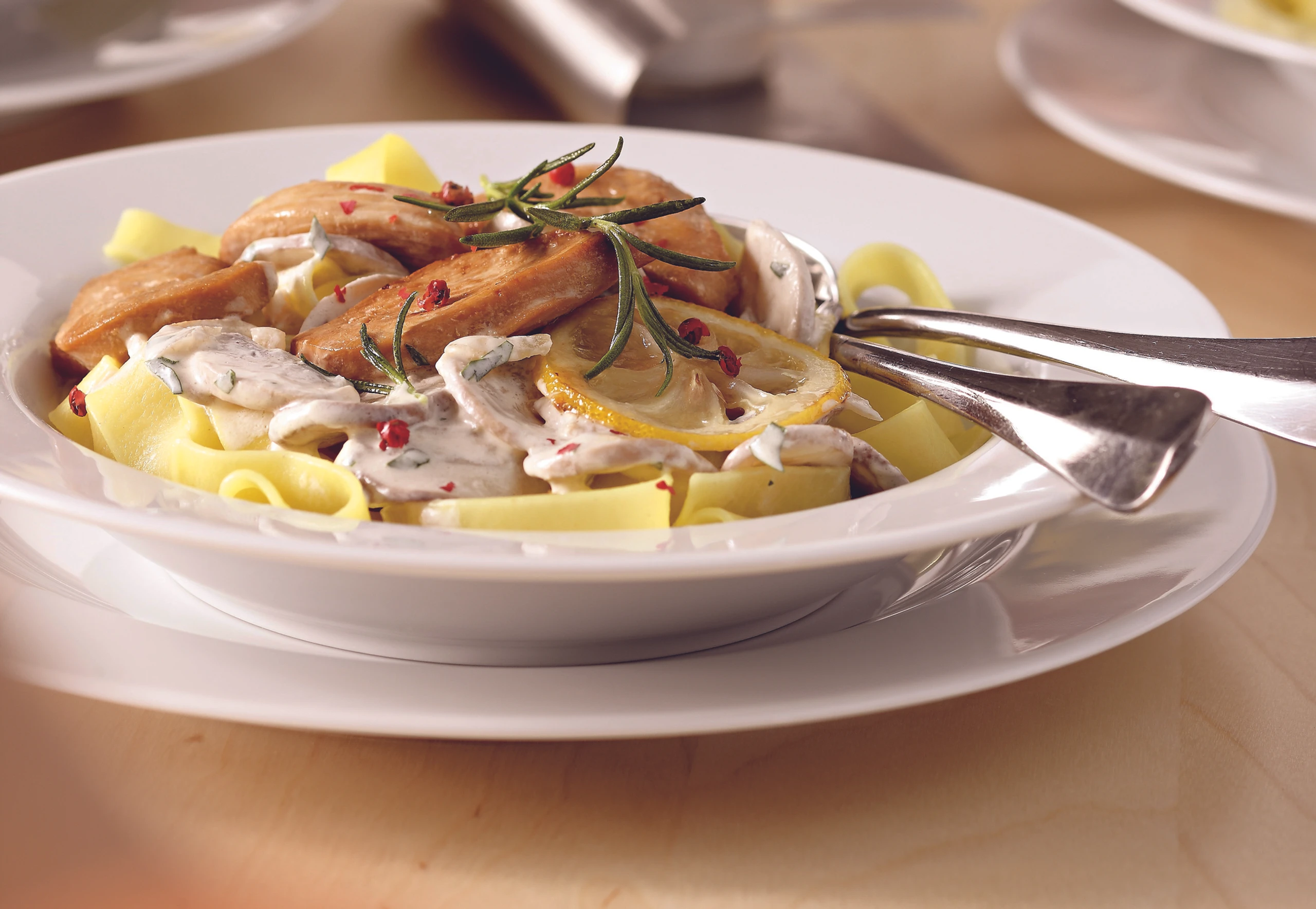 - Hühnerstreifen, Zitronenscheiben und Rosmarin auf die Fettucine legen. Mit Rosa Beeren garnieren.