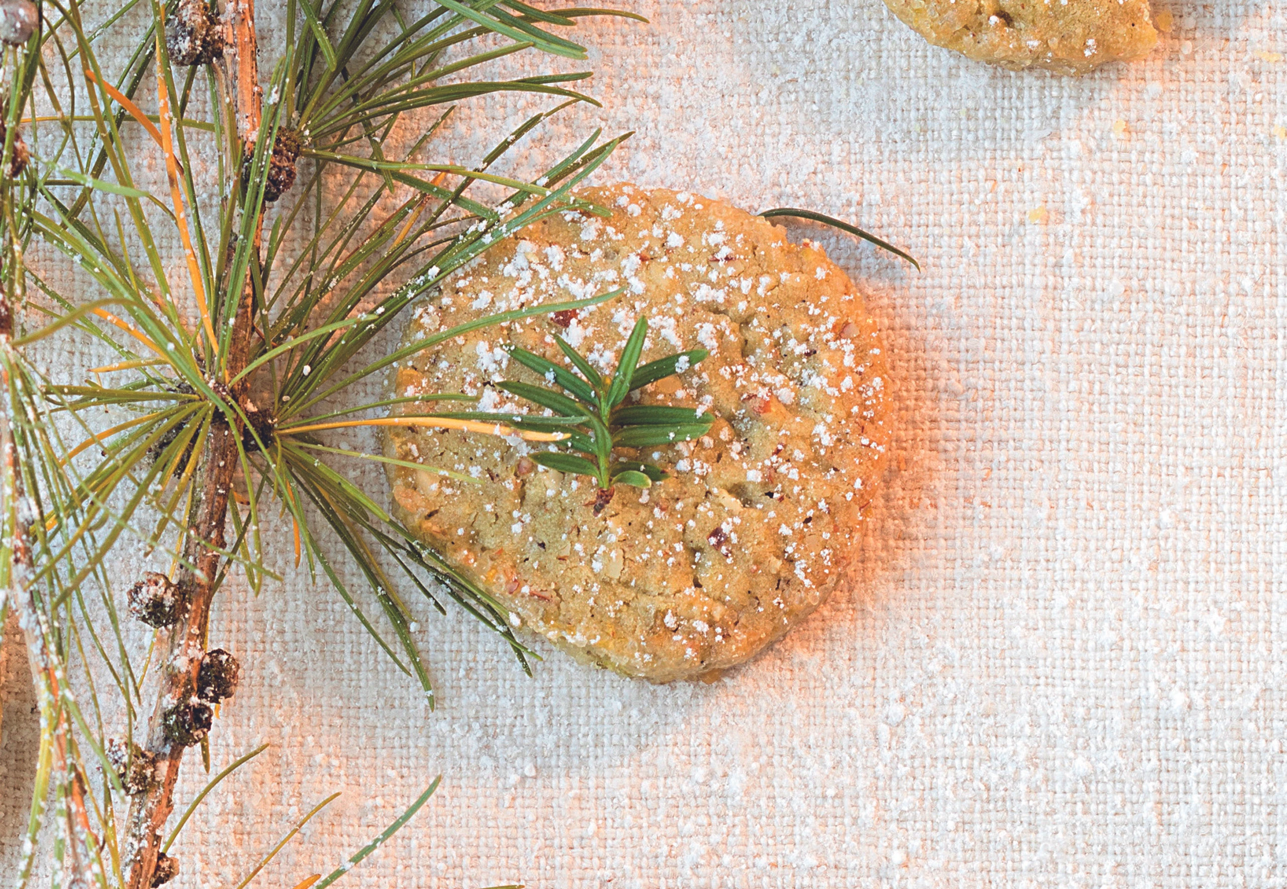Fichtenzucker auf der Arbeitsfläche verteilen. Teig zu 2 ca. 20 cm langen Rollen formen und im Fichtenzucker wälzen. Rollen separat in Frischhaltefolie wickeln und für ca. 10 Stunden kühl stellen.