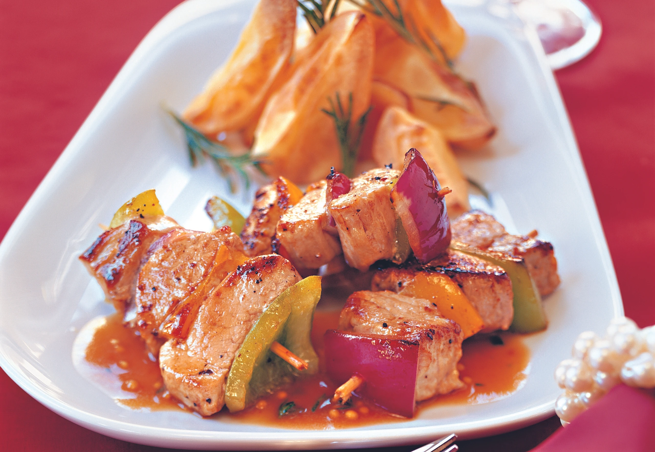 Im Bratrückstand Senfkörner anschwitzen, mit Bratensaft aufgießen und aufkochen. Spieße mit Sauce und Erdäpfeln anrichten.