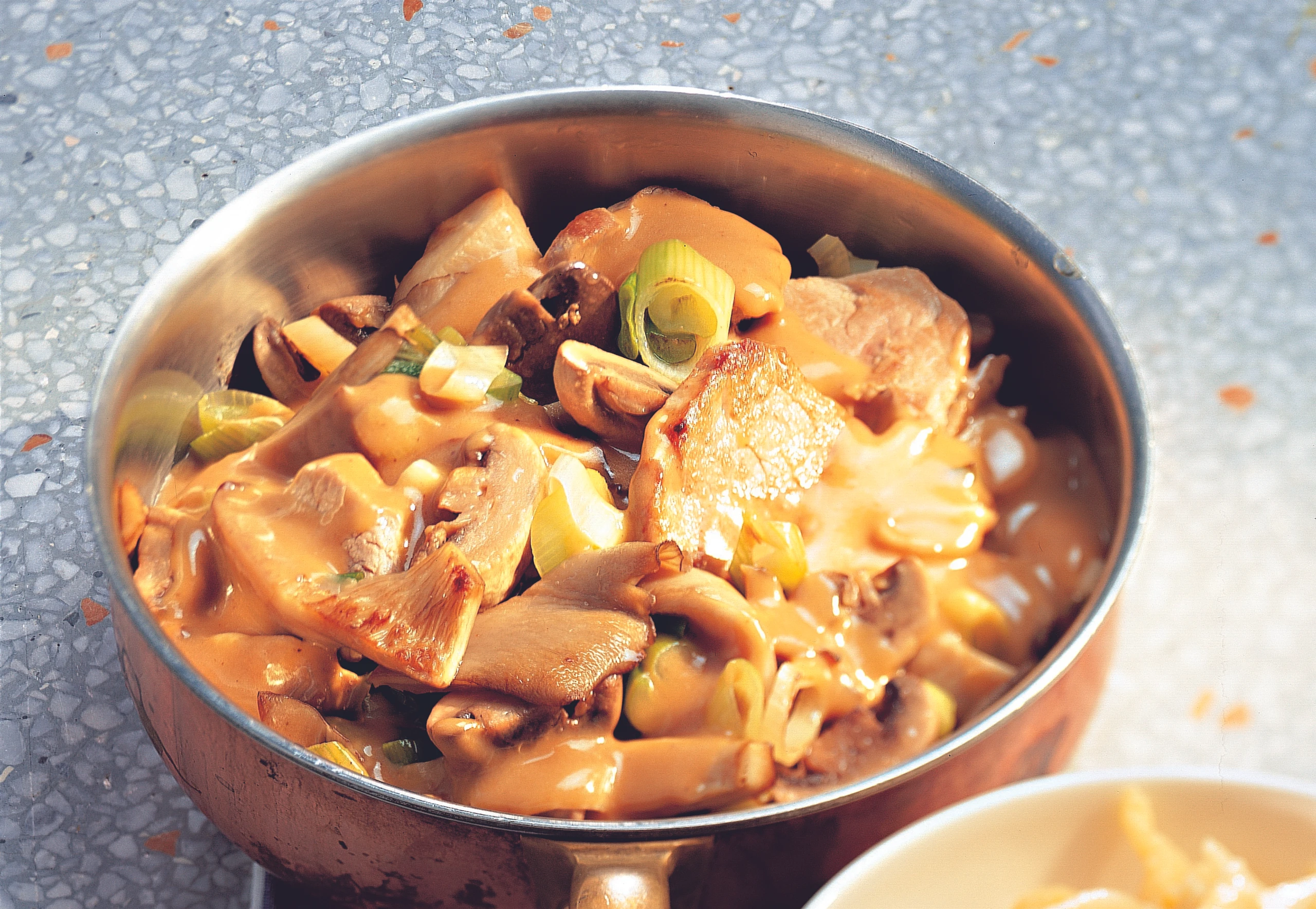 Jungzwiebeln putzen und in 1 cm dicke Scheiben schneiden. Fleisch in Scheiben schneiden, salzen und pfeffern. In einer Pfanne Öl erhitzen. Fleisch darin scharf anbraten und herausnehmen.