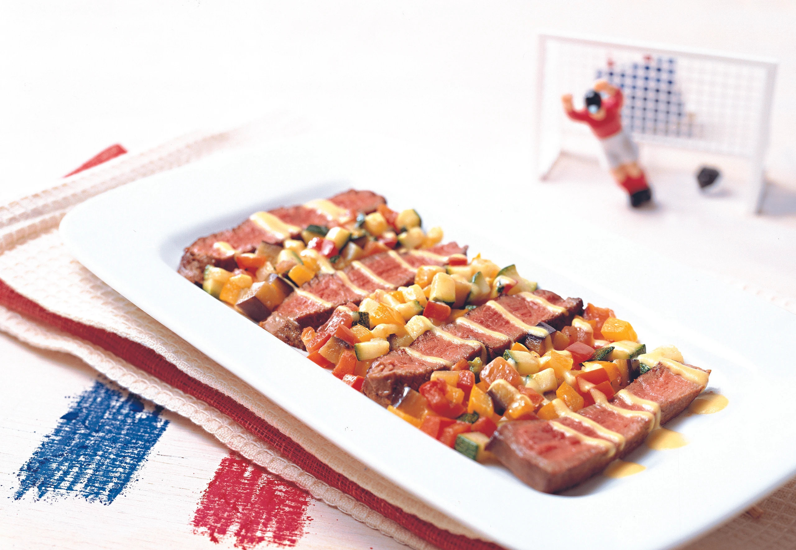 Öl erhitzen. Fleisch darin auf beiden Seiten je ca. 2 Minuten braten, herausnehmen, mit Salz und Pfeffer würzen. Bratrückstand mit wenig Suppe ablöschen, aufkochen und abseihen. Fleisch mit Saft, Kartoffelcreme und Ratatouille servieren.