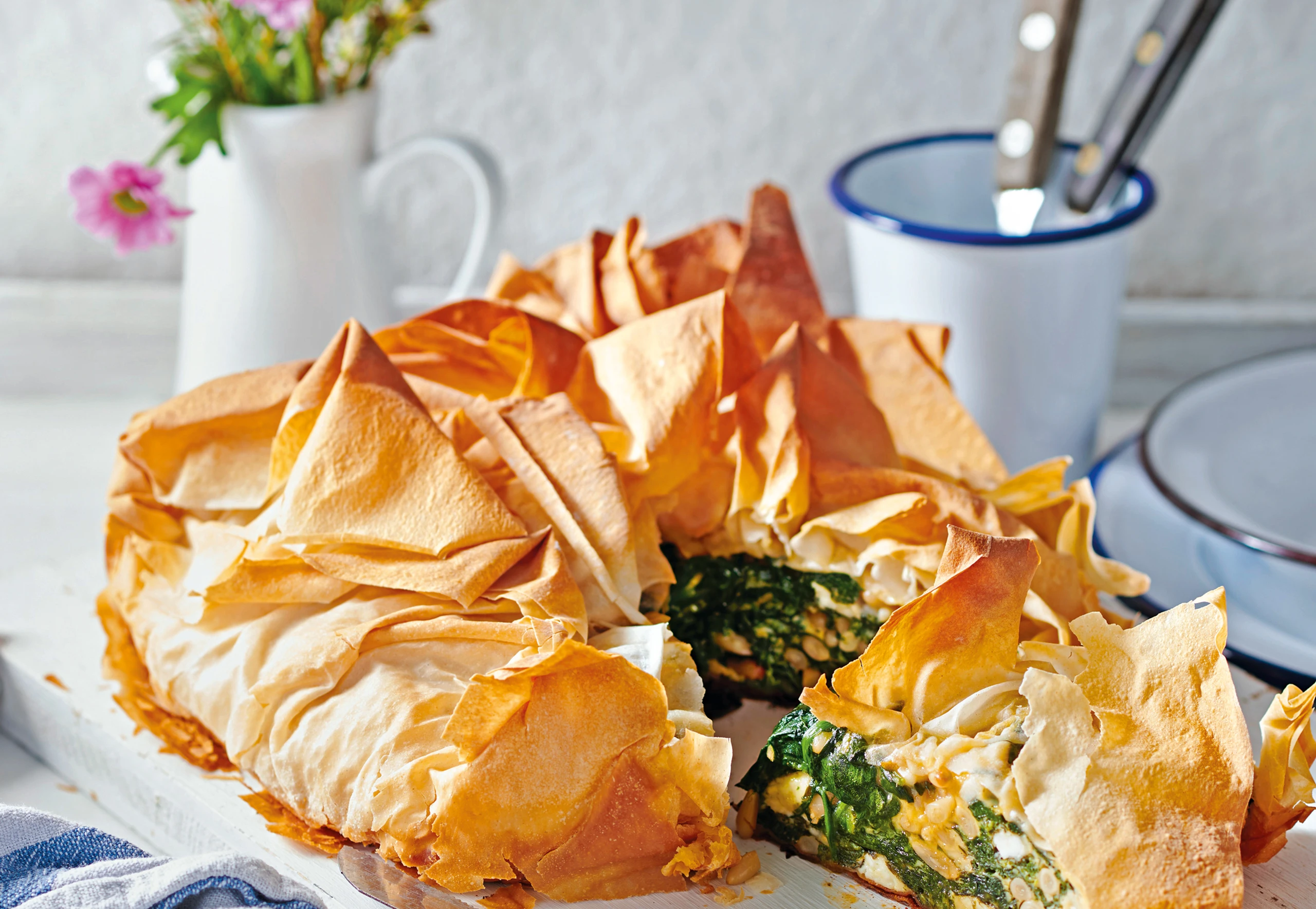 Rohr auf 200°C vorheizen. Ein Filoblatt in eine Pfanne legen, mit 1 TL Olivenöl beträufeln und mit etwas Paprikapulver bestreuen. Restliche Blätter auf die gleiche Art übereinander schichten. Spinatmasse einfüllen und den Teig darüber einschlagen. Filo-Pie in der Pfanne ca. 2 Minuten anbacken. Im Rohr (mittlere Schiene / Gitterrost) ca. 25 Minuten goldbraun backen. Herausnehmen und noch warm genießen.