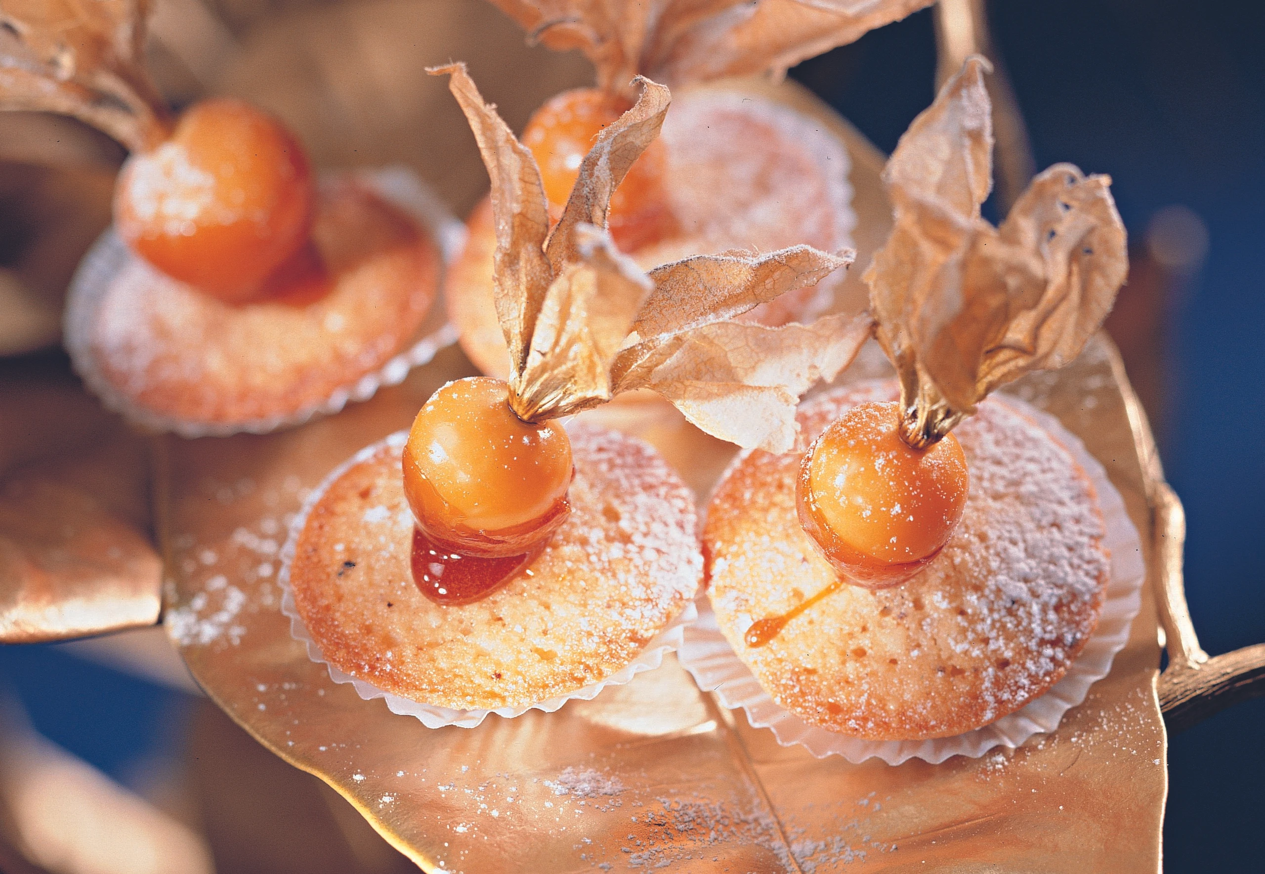 Für die Garnitur Wasser mit Zucker vermischen und auf kleiner Flamme unter öfterem Umrühren (Holzkochlöffel!) hellbraun karamellisieren lassen. Die Häutchen der Erdkirschen hoch ziehen. Die Früchte in den Karamell tauchen, auf die Törtchen setzen und auskühlen lassen. Zum Anrichten mit Staubzucker bestreuen.