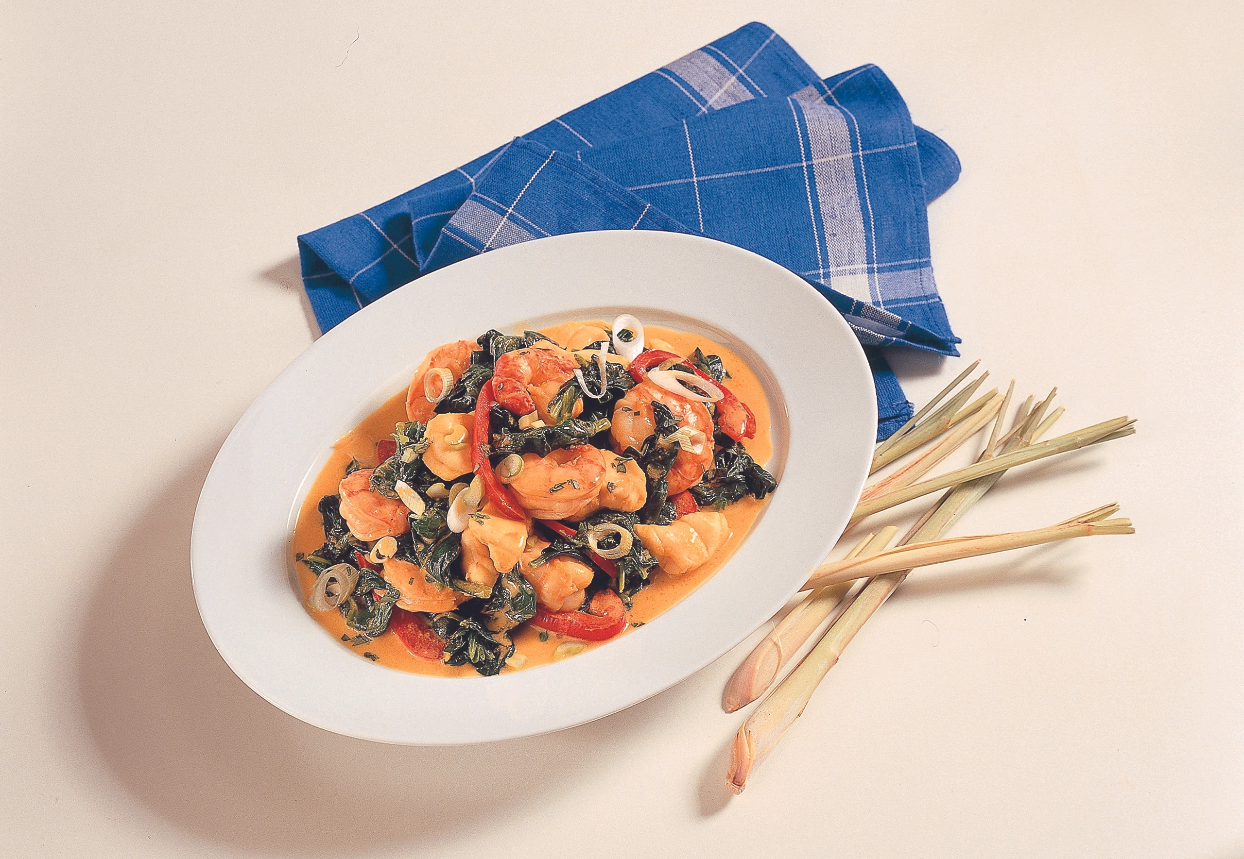 Fisch zufügen, Temperatur reduzieren, Fisch zugedeckt ca. 2 Minuten dünsten. Garnelen zufügen und zugedeckt ca. 3 Minuten dünsten. Spinat vorsichtig unterrühren. Fischcurry mit Zitronen- oder Limettensaft, Sojasauce und Salz abschmecken, Zitronengras entfernen. Curry mit Koriander und Jungzwiebel bestreut servieren.