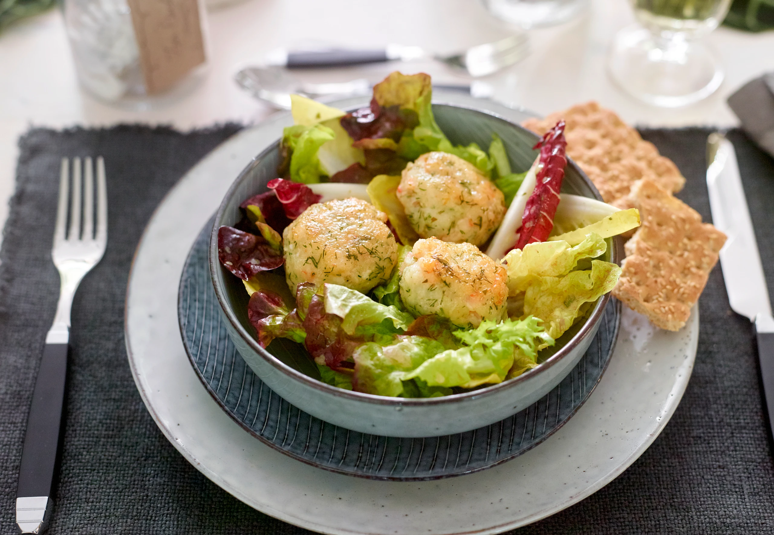 Für die Bällchen Kabeljau und Shrimps in möglichst kleine Stücke schneiden, mit Eiklar, Ingwer, Dille und Stärke gut verrühren. Masse mit Salz und Pfeffer würzen. Aus der Masse 12 Kugeln formen und ein wenig flachdrücken.