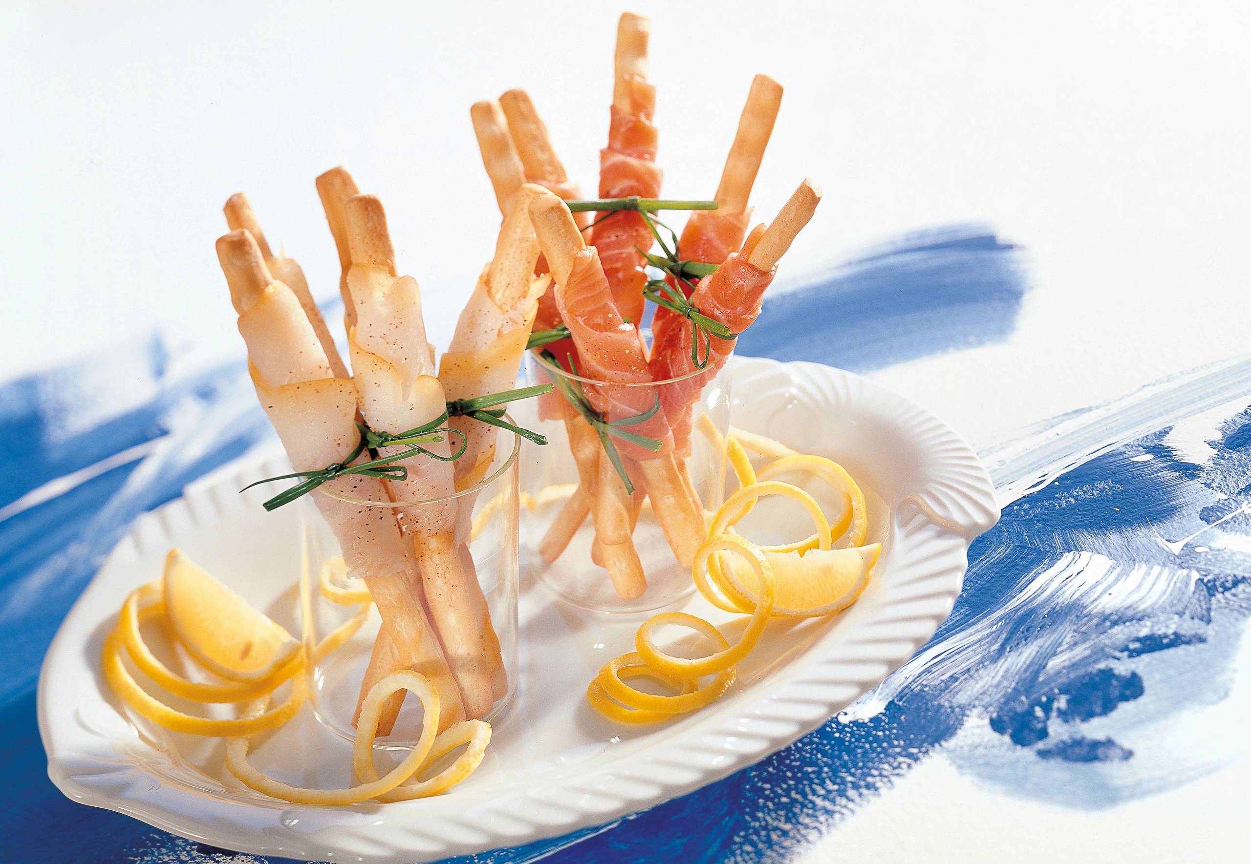 Zusätzlich kann man die Grissini mit Zitronenspalten und dünnen Streifen von Zitronenschale (gelingt am besten mit einem Kanneliermesser) garnieren, bzw. die Fischfilets mit einigen Tropfen Zitronensaft beträufeln.