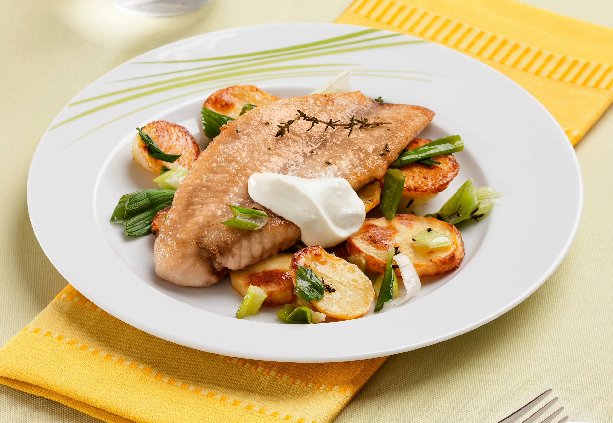 - Für die Sauce Rahm, Wasabi, Salz und Pfeffer verrühren. Fisch mit Erdäpfeln, Jungzwiebeln und Sauce servieren.