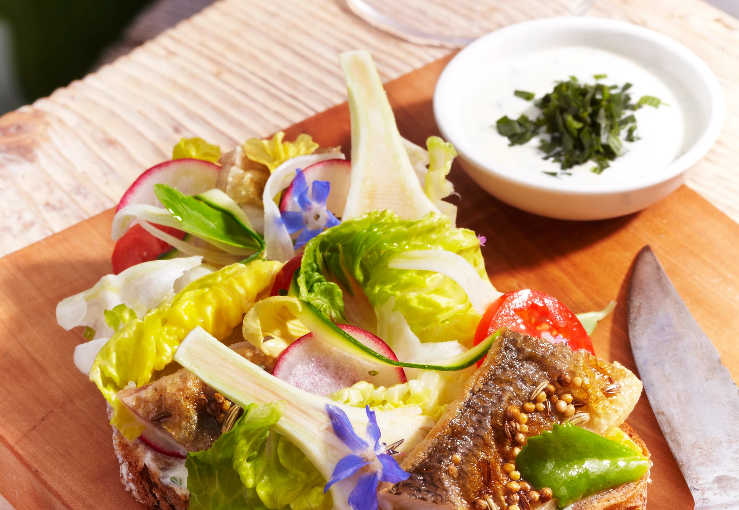 - Brote auf einer Seite toasten, mit Estragonrahm bestreichen, mit Gemüse und Fischfilets belegen, mit Meersalz und Olivenöl würzen. Eventuell mit Kräutern, Keimlingen und Blüten garnieren.