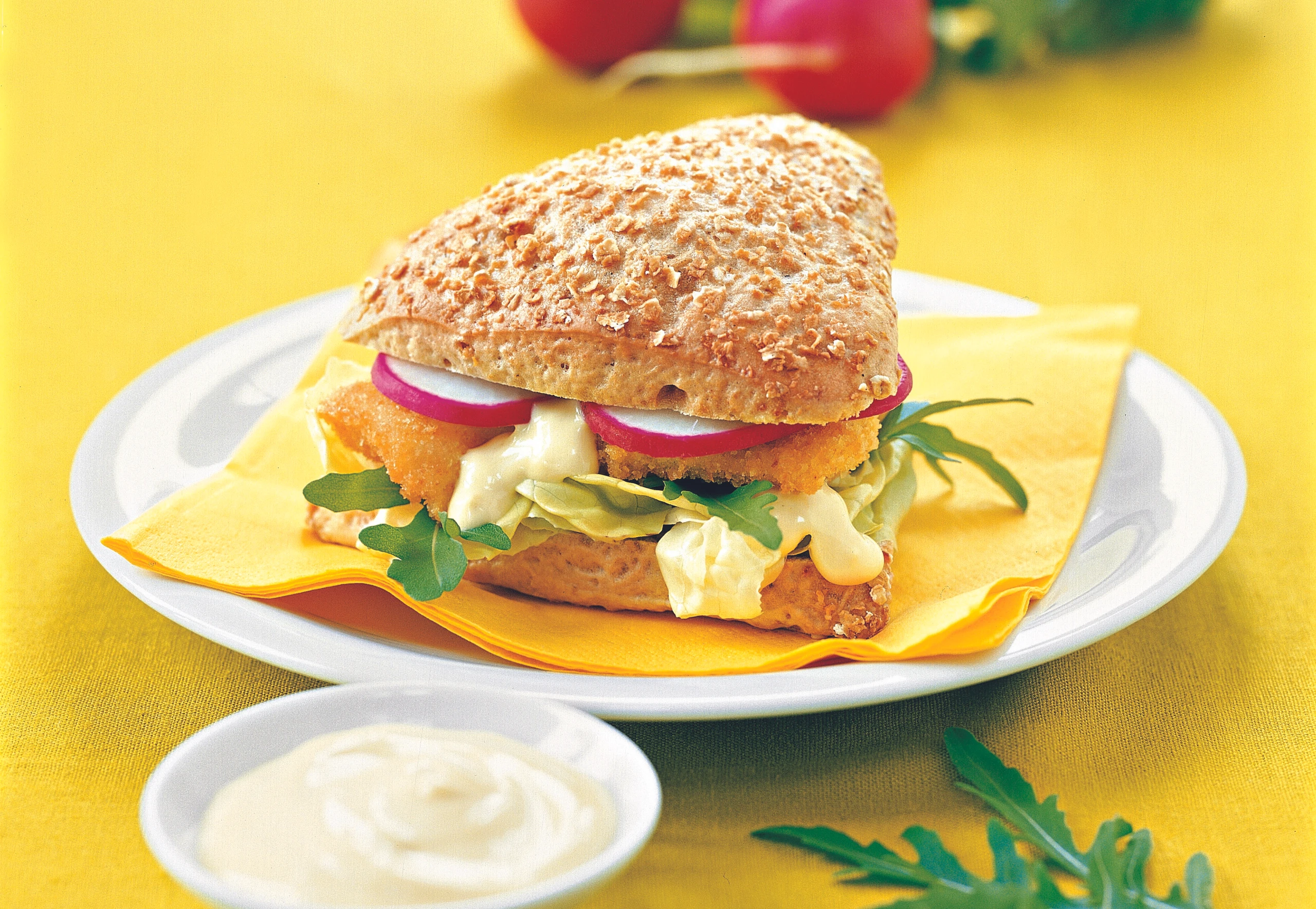 Weckerl durchschneiden. Die Böden mit Salat und Rucola, dann mit Schollenfilets belegen. Radieschen und Sauce auf den Filets verteilen. Deckel darauf setzen und behutsam andrücken.