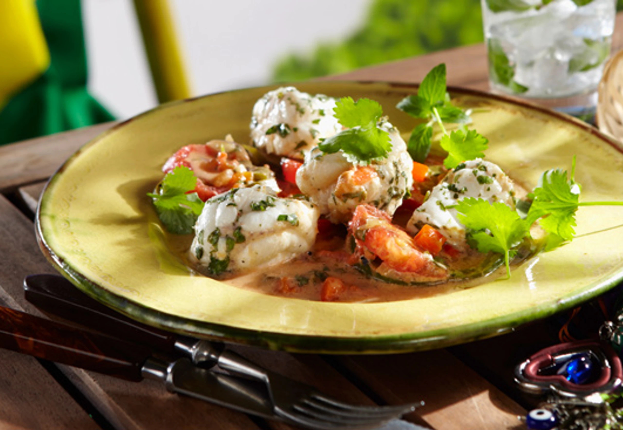 Öl erhitzen, Zwiebel und Knoblauch darin anschwitzen. Paprika- und Paradeiswürfel zugeben. Fischfilets samt Marinade darauf verteilen, mit Paprikaringen und Paradeisscheiben belegen, mit Salz und Pfeffer würzen. Kokosmilch zugießen. Moqueca zudecken und ca. 20 Minuten köcheln. Herd ausschalten, Moqueca ca. 15 Minuten ziehen lassen.
