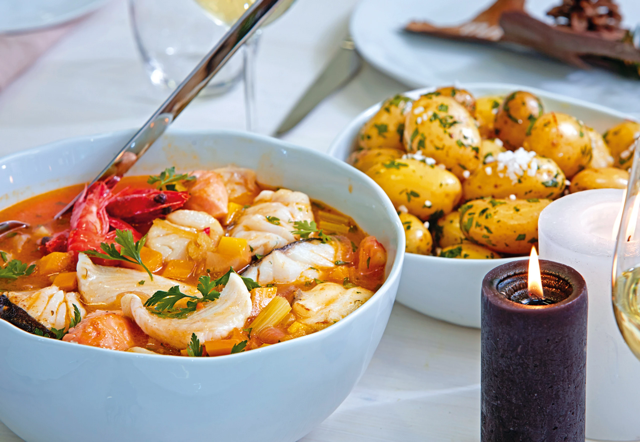 Fischstücke und Garnelen in die Suppe legen und unter dem Siedepunkt ca. 3 Minuten ziehen lassen. Erdäpfel in aufgeschäumter Butter schwenken. Petersilie untermischen. Erdäpfel anrichten und mit Meersalz bestreuen. Fischfilets und Garnelen mit der Suppe anrichten, mit übrigen Kräutern bestreuen und mit den Erdäpfeln servieren.