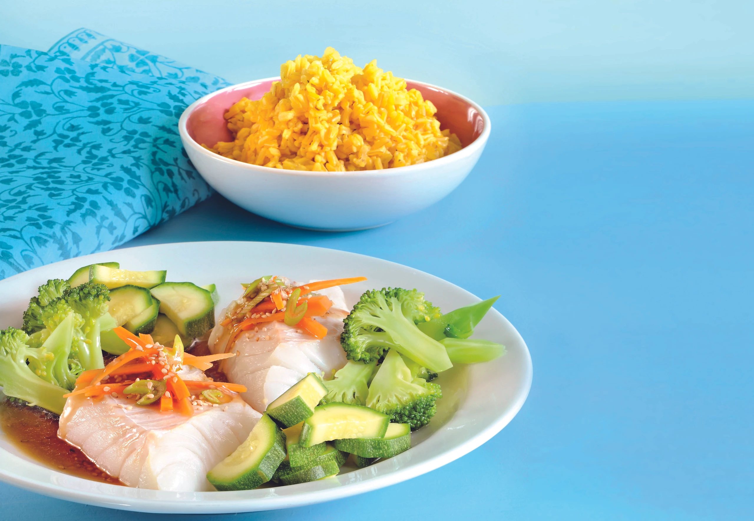 Kabeljau mit Gemüse anrichten, mit Jungzwiebeln bestreuen, mit Sesam-Dip beträufeln. Restlichen Dip und gelben Naturreis dazu reichen.