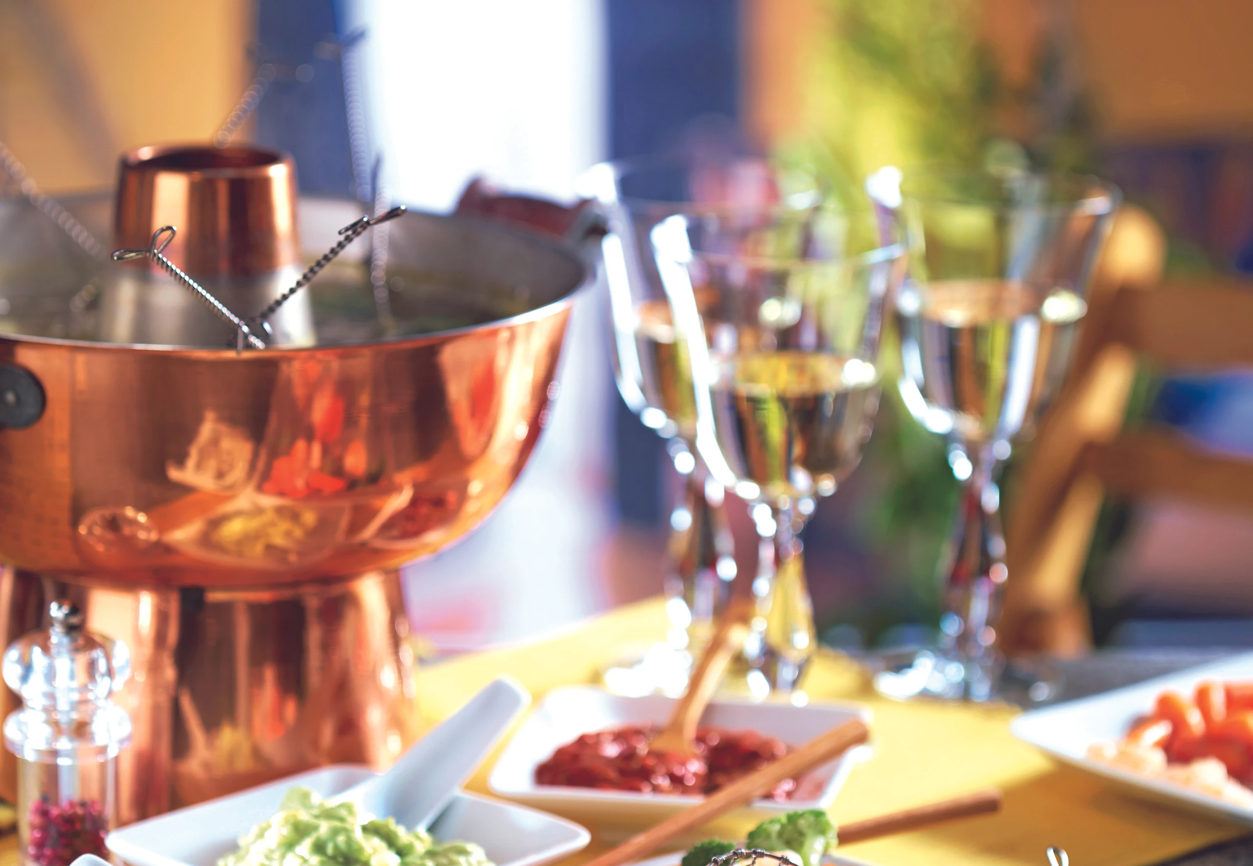 Suppe in den Fondue-Topf gießen und am Herd erhitzen. Topf auf den Rechaud stellen. Fisch, Garnelen und Gemüse in Fonduekörbchen legen und in der Suppe garen. Herausheben und mit den Saucen anrichten. Dazu passt Baguette oder Weißbrot.
