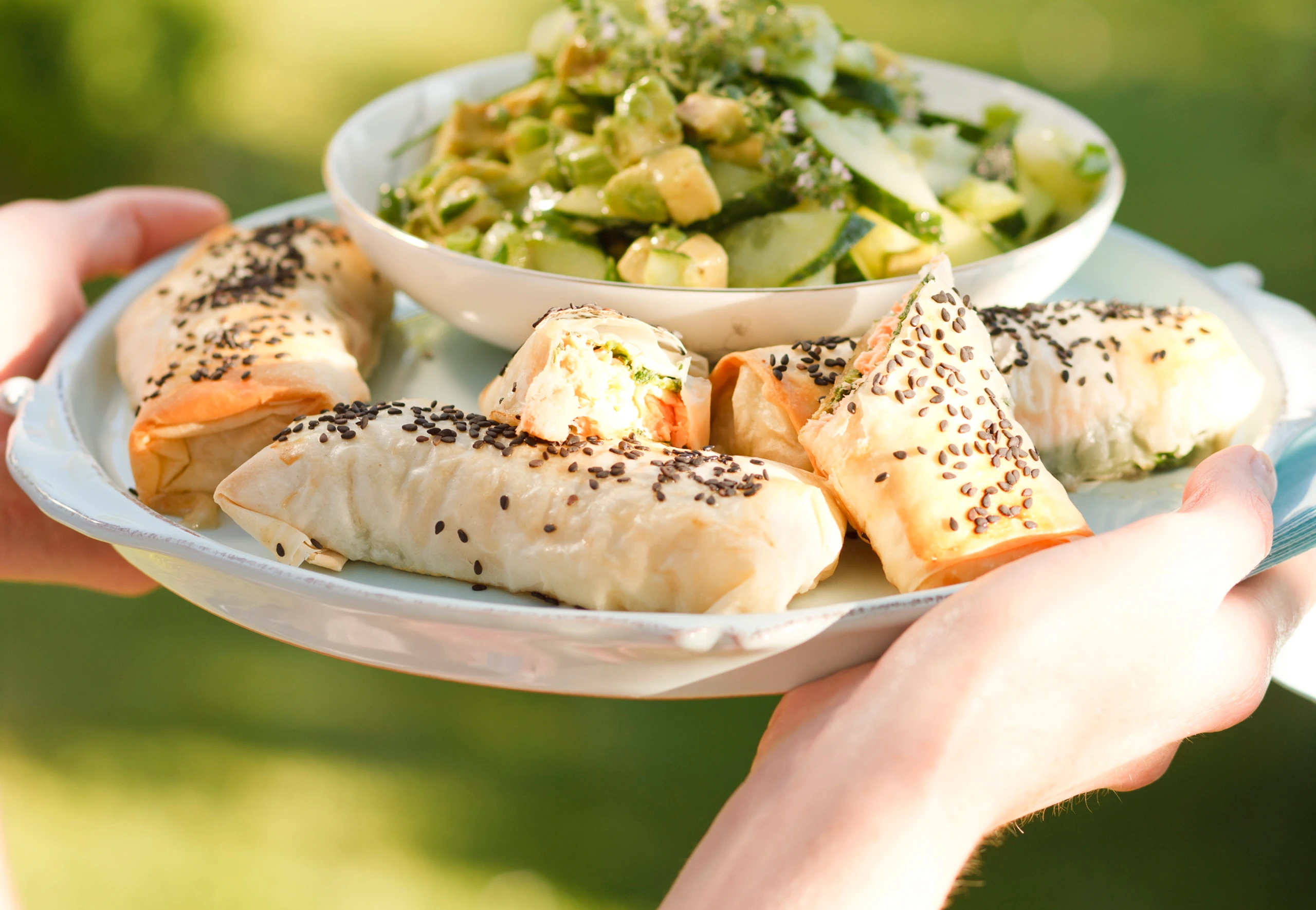 Fischpäckchen mit Gurken-Avocado-Salat servieren.