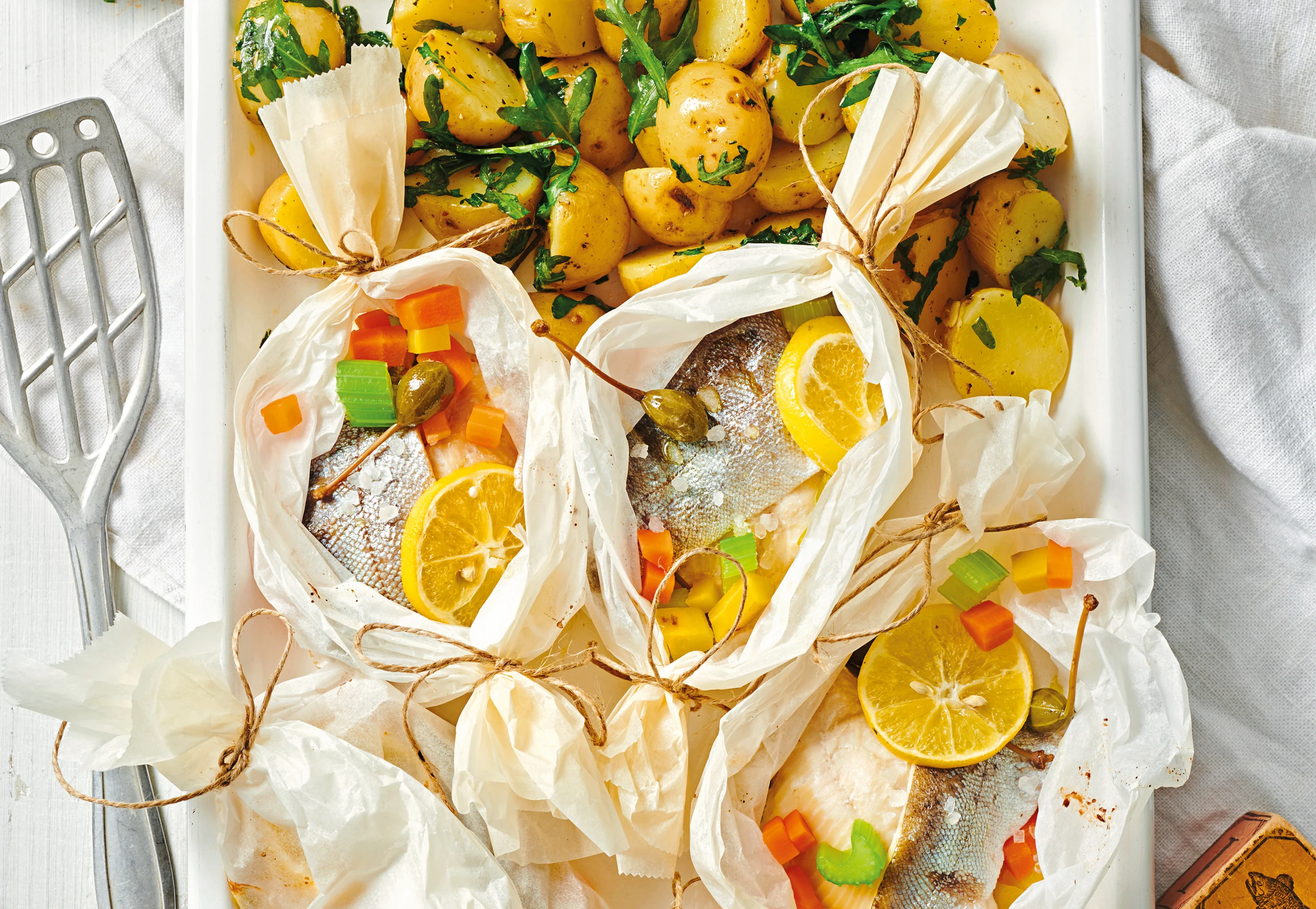 Fischpäckchen mit Krensauce und Rucola-Erdäpfeln