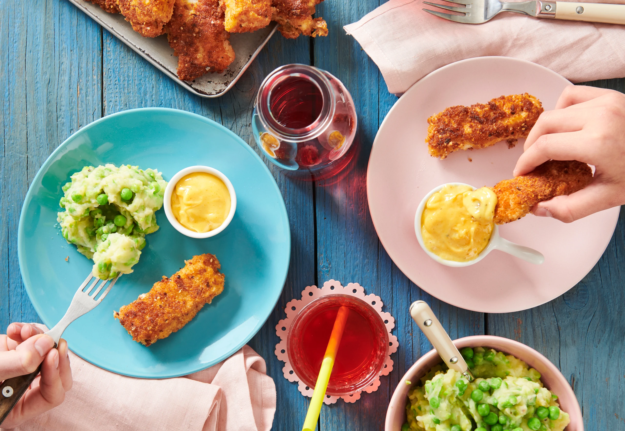 In einer Pfanne 1 Finger hoch Öl erhitzen und die Fischstäbchen darin beidseitig knusprig braten. Herausnehmen und auf Küchenpapier abtropfen lassen. Fischstäbchen mit Erbsenpüree und Mayo servieren.