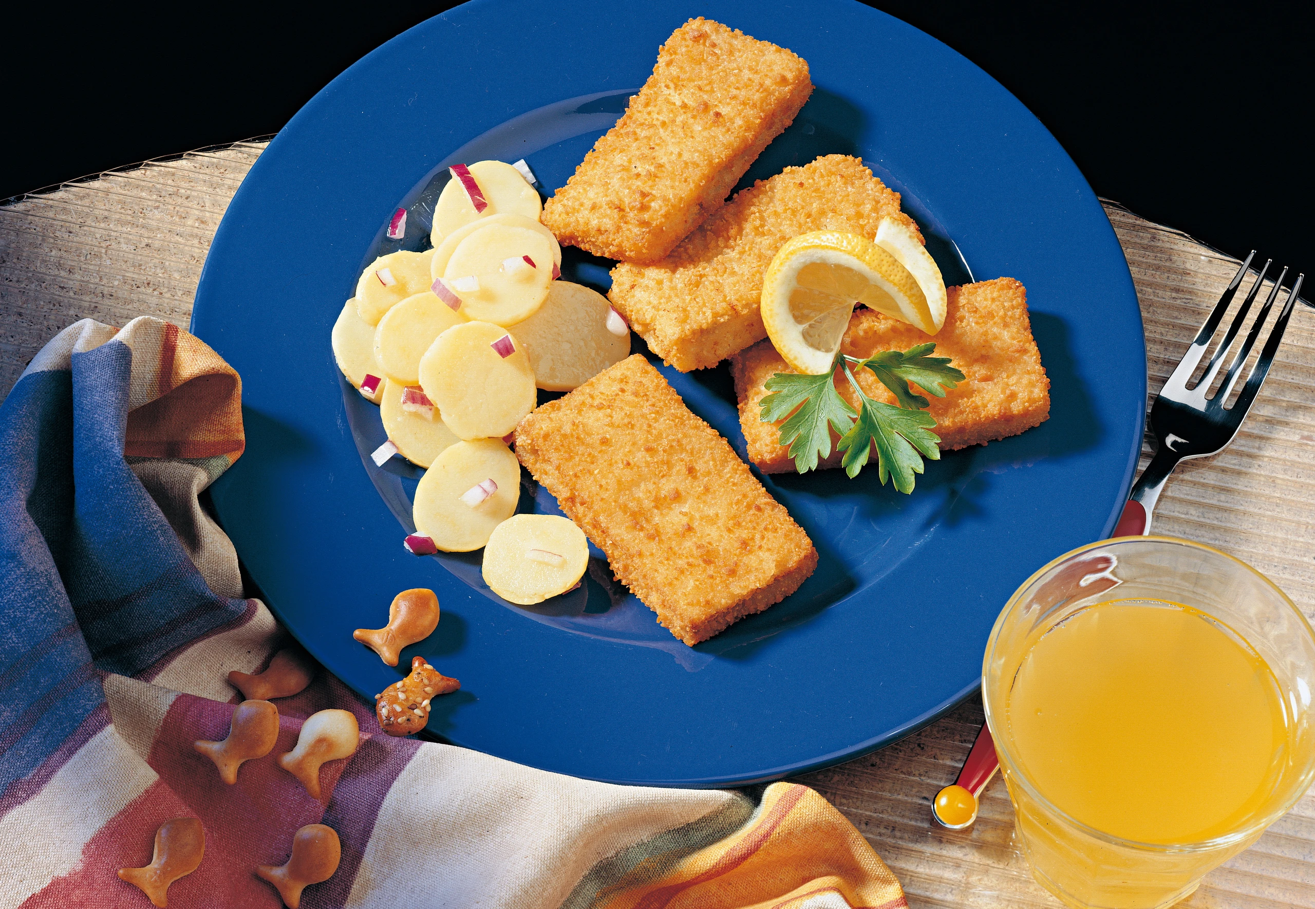 Fischstücke in Mehl, verquirltem Ei und Bröseln panieren und in heißem Fett goldgelb backen.