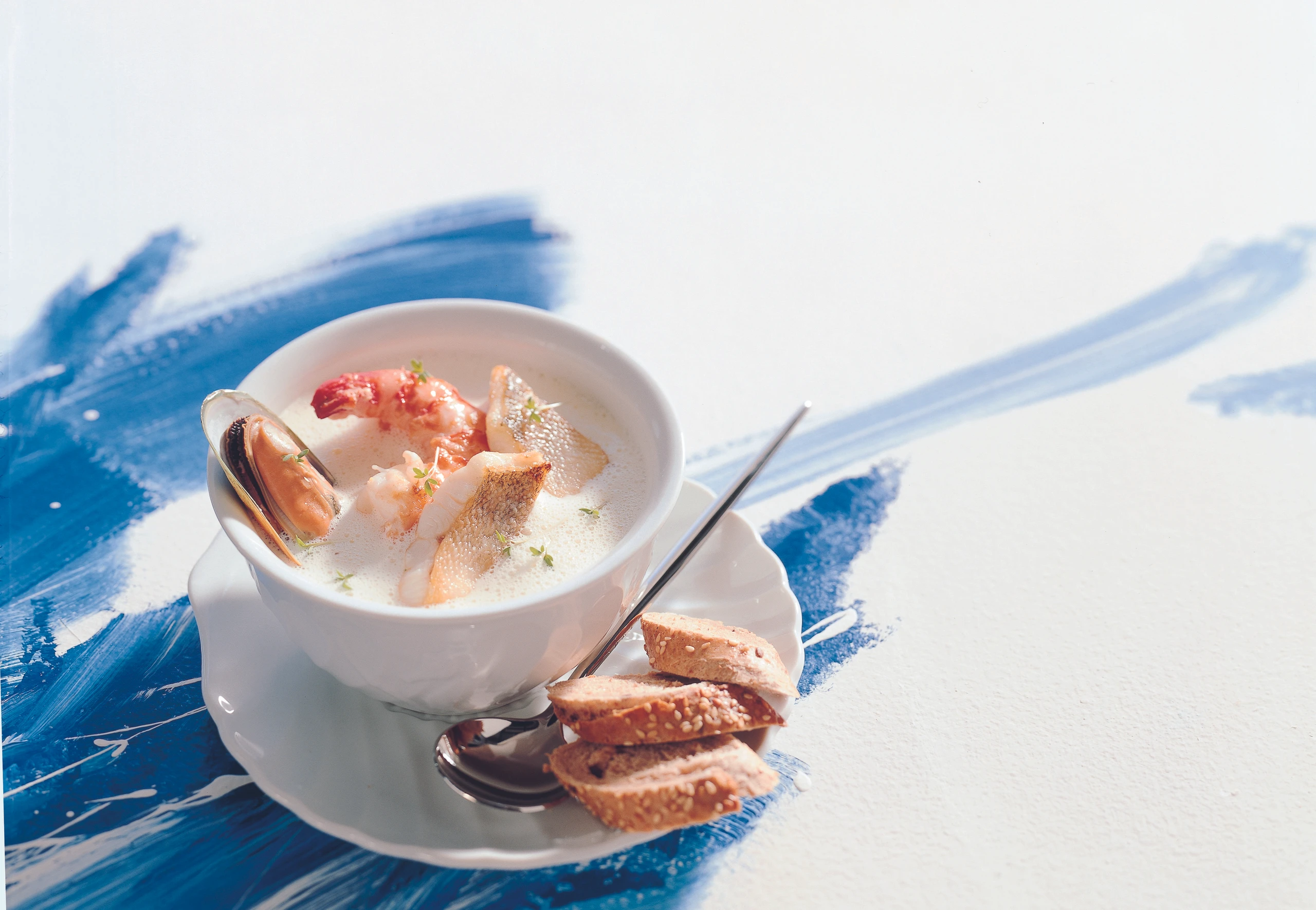 Kresseblättchen von den Stielen schneiden. Butter in die Suppe rühren und diese mit einem Stabmixer schaumig aufschlagen. Fischstücke, Garnelen und Muscheln (samt Flüssigkeit vom Erwärmen) in Tellern oder Suppentassen anrichten. Suppe eingießen und mit Kresseblättchen bestreut anrichten. Mit Weißbrot servieren.