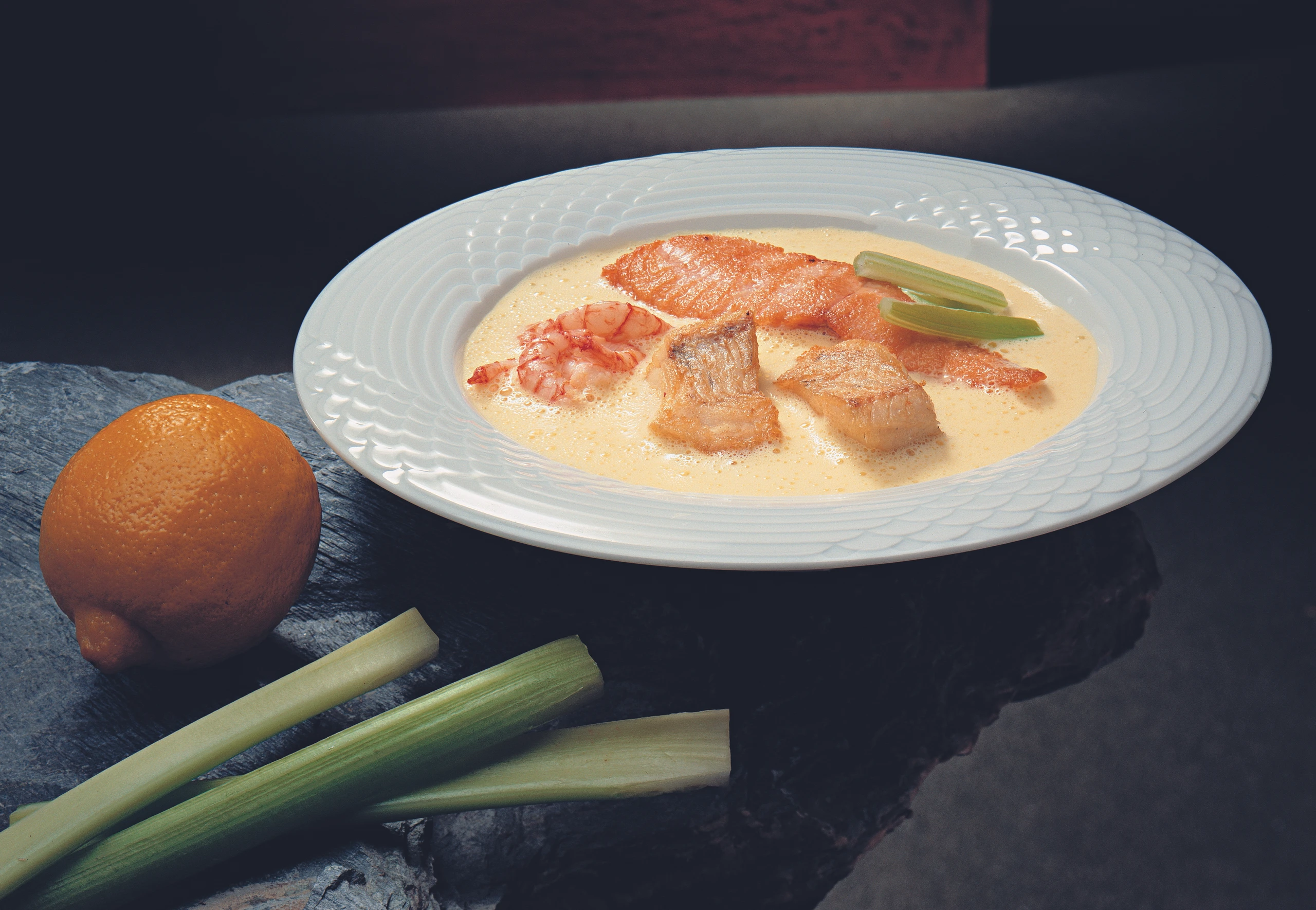 - Fischsuppe mit Salz, Pfeffer und Zitronensaft würzen. Fischfilets, Shrimps und Sellerie in Suppentellern anrichten, Suppe darüber gießen und rasch servieren.