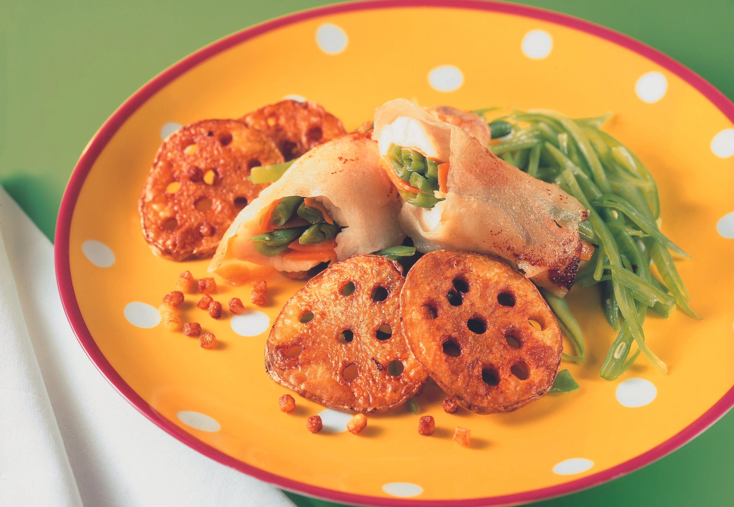 Schollenfilets in 8 möglichst gleiche, schmale Stücke schneiden. Reisblätter 1–2 Minuten (nicht länger) in kaltes Wasser legen. Blätter herausheben und nebeneinander auflegen, Fisch salzen. Je zwei Fischstücke quer in die Mitte der Teigblätter legen, Gemüsefülle dazwischen verteilen, mit Salz und Thymian würzen. Seitliche Teigränder ca. 1 cm breit einschlagen, Reisblätter über die Fülle straff einrollen.