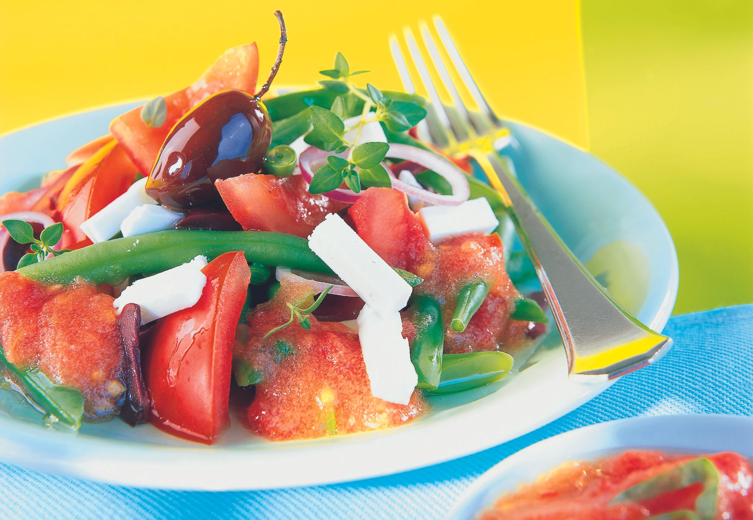 Fisolen, Tomatenspalten, Zwiebeln und Oliven mit dem Dressing vermischen, anrichten und mit Schafkäse bestreuen.