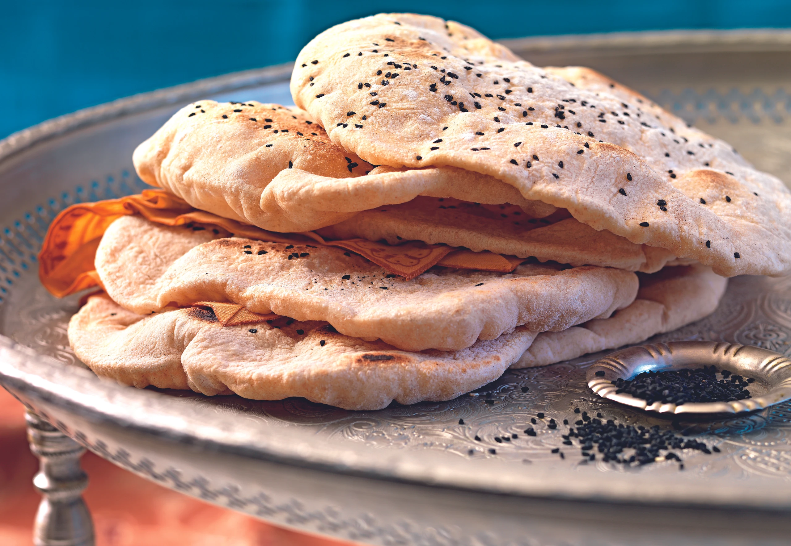Rohr auf 60°C vorheizen. Teig durchkneten, in 6 gleich große Stücke teilen und zu runden Fladen ausziehen oder auswalken. Kümmel darauf verteilen und fest andrücken. Fladen in einer beschichteten Pfanne beidseitig ohne Fett backen, bis sie Blasen werfen und leicht bräunliche Stellen bekommen. Fladen in ein feuchtes Tuch einschlagen und im Rohr warm halten, bis alle gebacken sind.