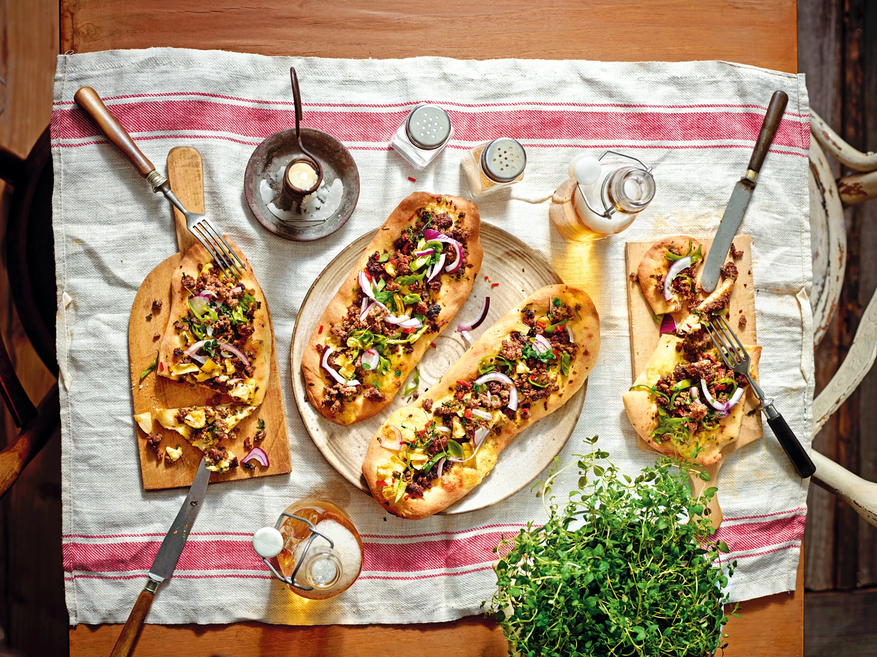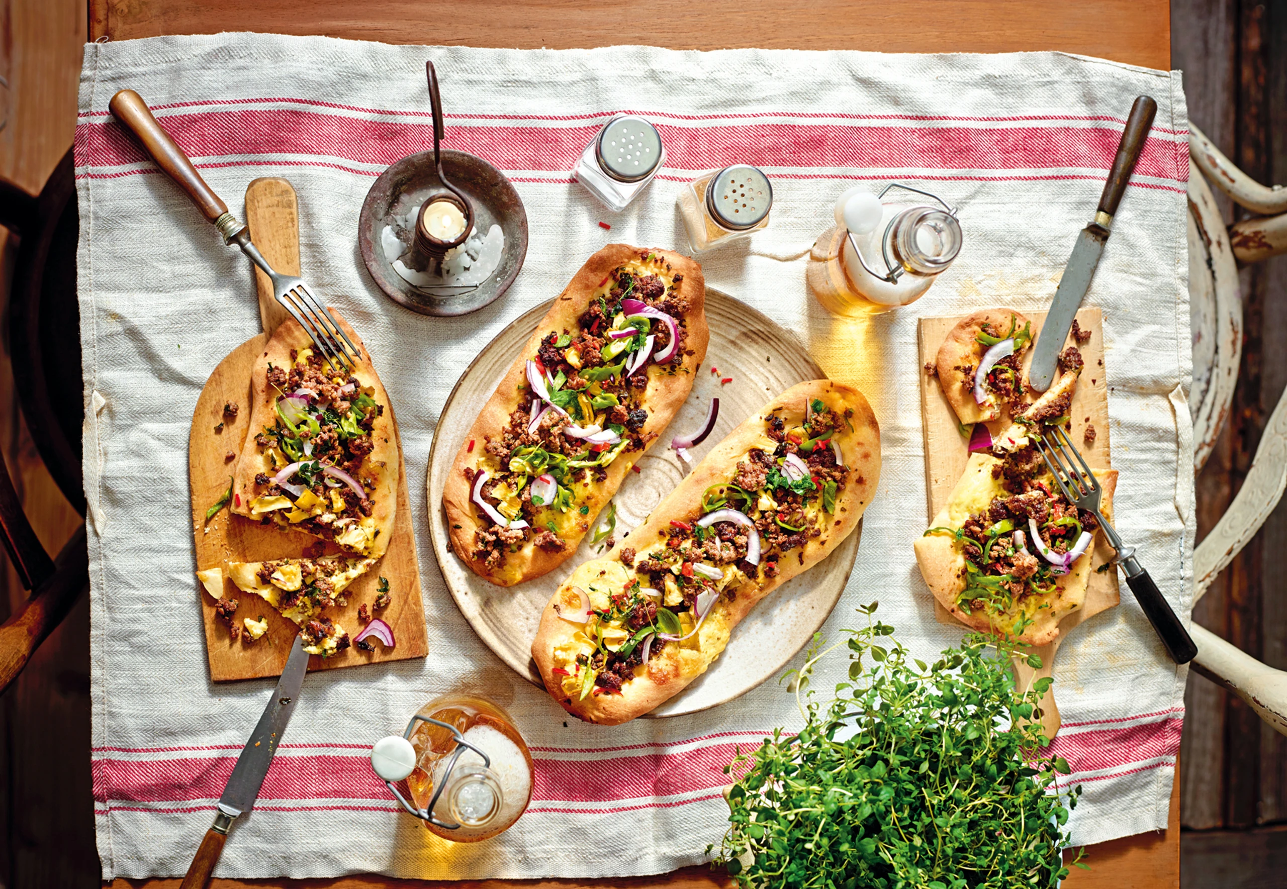 Fladenbrote mit Faschiertem, Artischocken und Pimentos