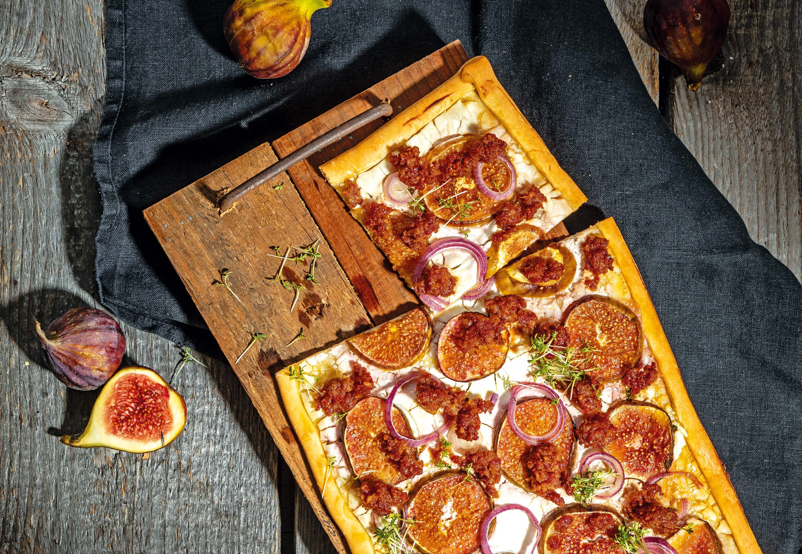 Flammkuchenteig auf das Blech legen und mit dem Ziegenfrischkäse bestreichen. Mit Feigen, Zwiebelringen und Salsiccia belegen. Im Rohr (mittlere Schiene) ca. 25 Minuten backen. Flammkuchen herausnehmen, mit Kresse und Pfeffer bestreuen.