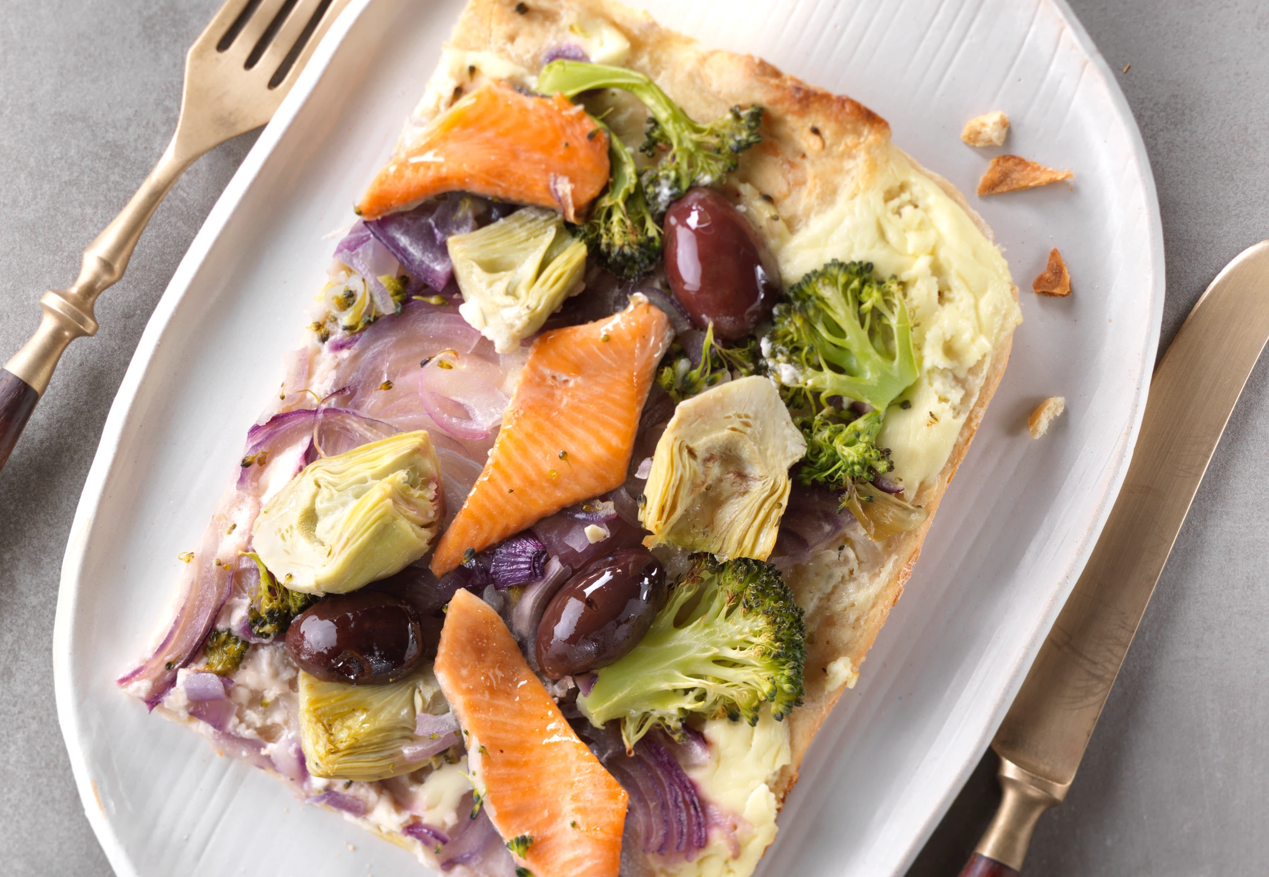 Teig auf einer bemehlten Arbeitsfläche in der Größe des Backblechs ausrollen, auf das Blech legen und dünn mit Crème fraîche bestreichen. Artischocken, Brokkoli, Zwiebeln, Oliven und Forellenfilets auf dem Teig verteilen. Flammkuchen im Rohr (mittlere Schiene) ca. 18 Minuten backen. Herausnehmen und portionieren.