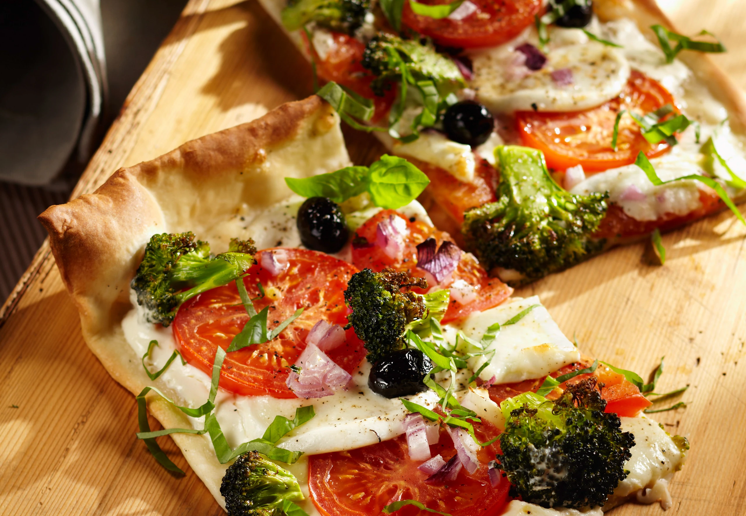 Caprese-Flammkuchen mit Brokkoli und Oliven