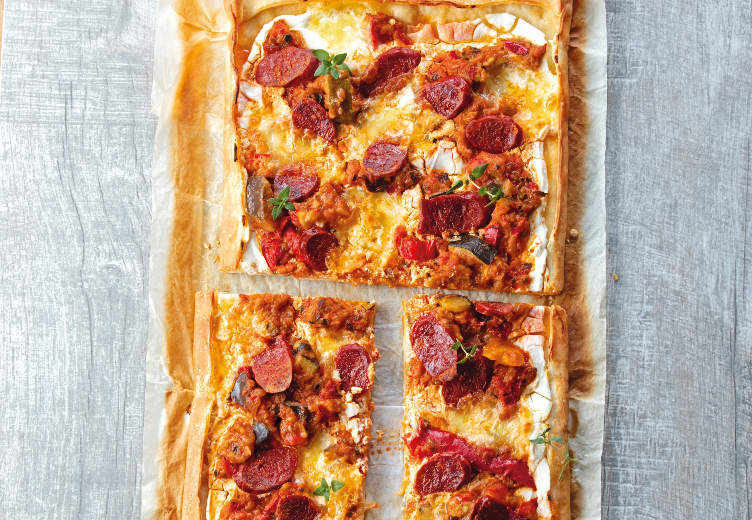 Flammkuchen mit Ratatouille, Chorizo und Mozzarella