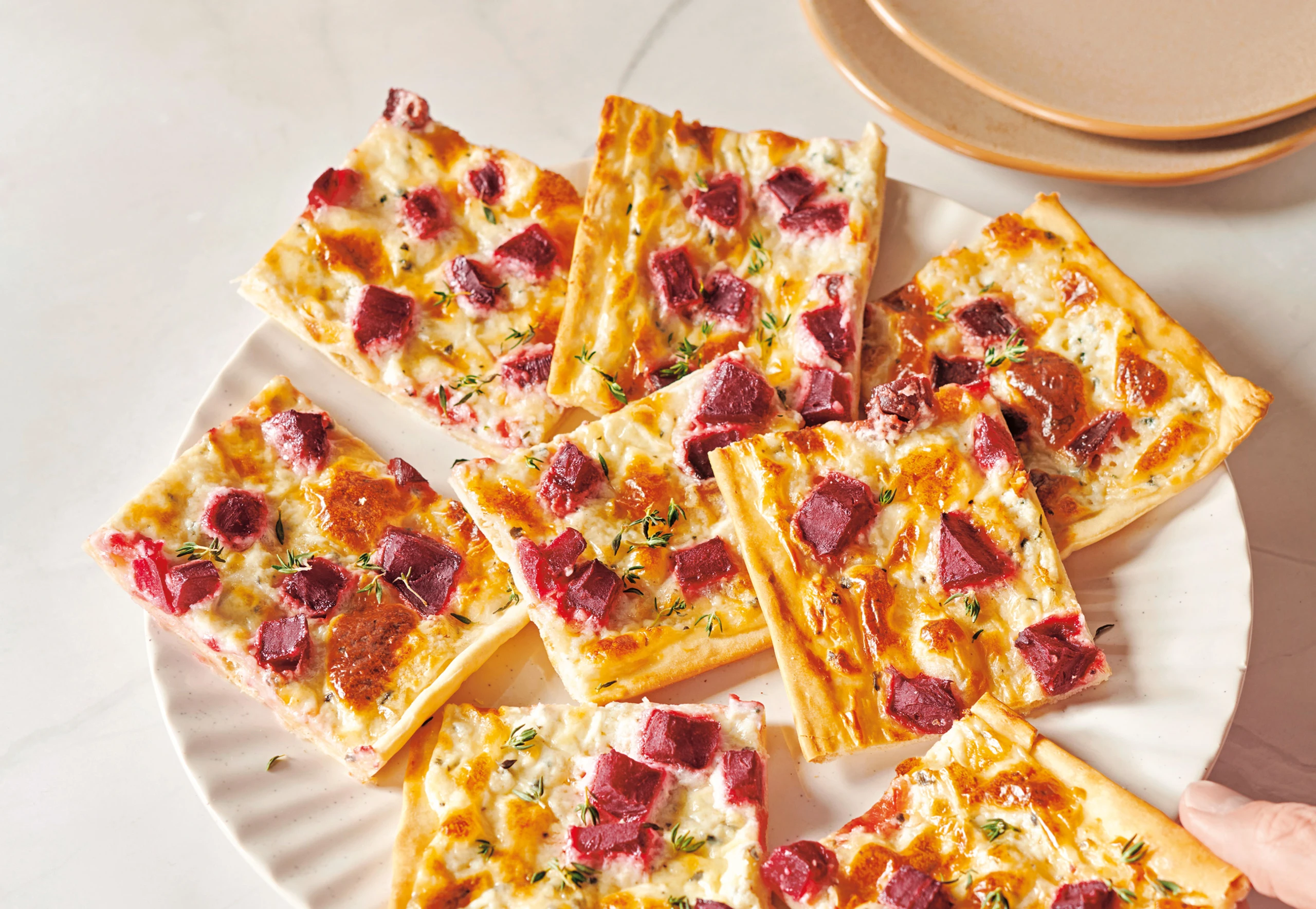 Flammkuchen mit Thymian-Frischkäse und Roten Rüben