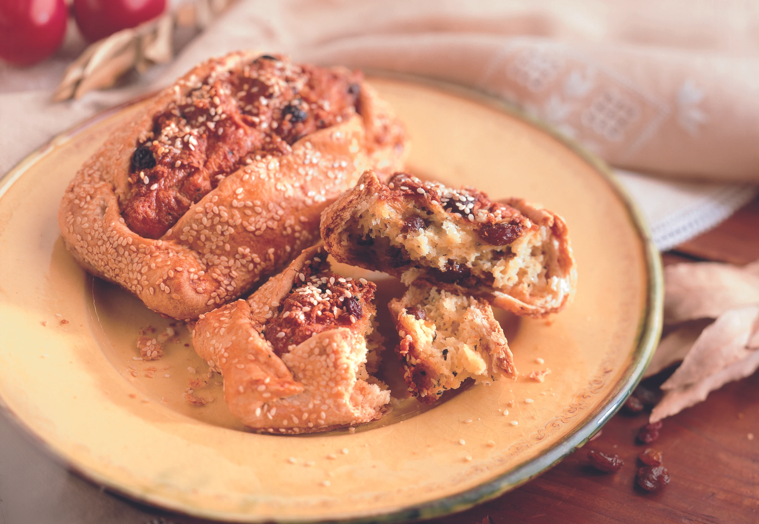 Backrohr auf 170 °C vorheizen. Backblech mit Backpapier belegen. Teig auf einer bemehlten Arbeitsfläche ca. 3 mm dick ausrollen, Scheiben (Ø 15 cm) ausstechen, jeweils 2 EL Fülle darauf setzen. Die Ränder jeder Scheibe so einbiegen, dass ein Viereck entsteht. Ränder mit einer Gabel festdrücken. Flaounes mit verquirltem Ei bestreichen und mit Sesam bestreuen.