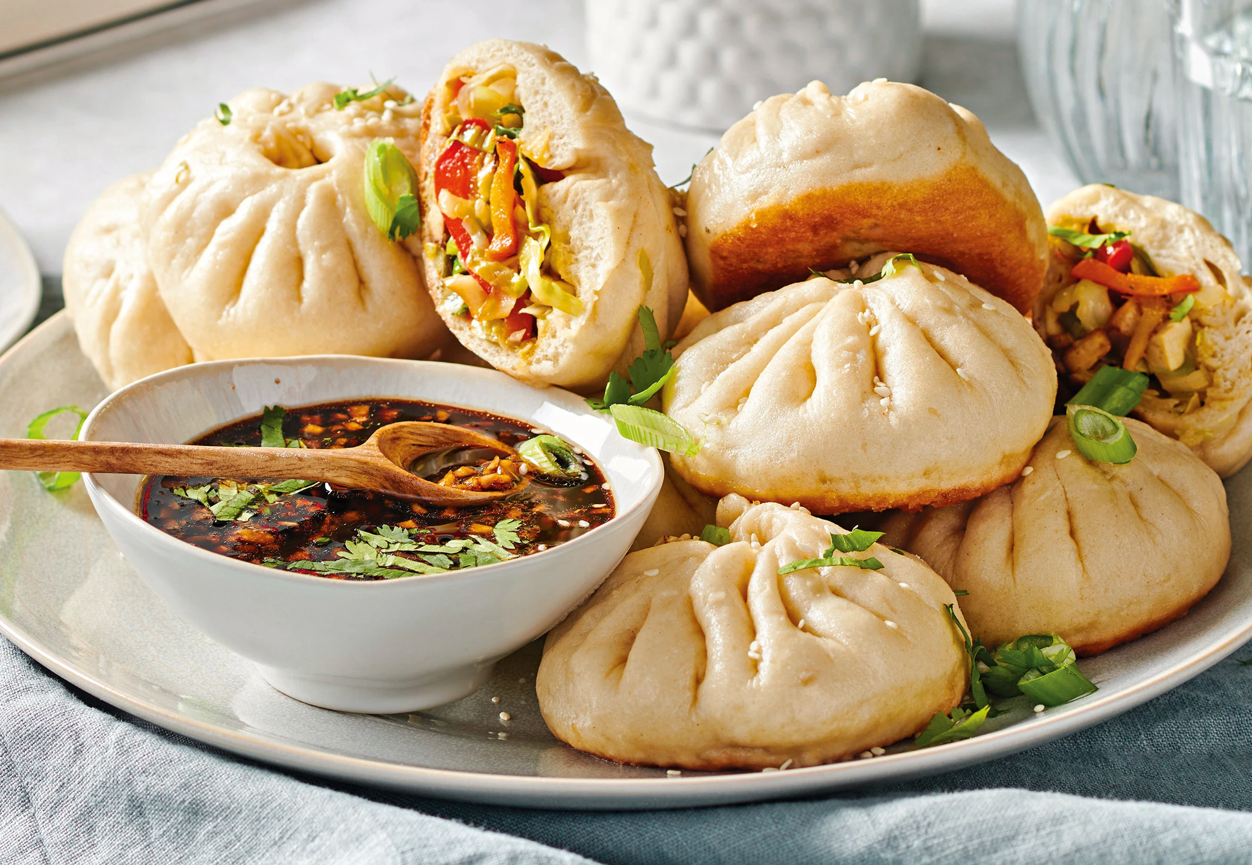 Für die Garnitur Jungzwiebel putzen und fein schneiden. Tascherl anrichten, mit Koriander, Sesam und Jungzwiebel bestreuen und mit dem Dip servieren.