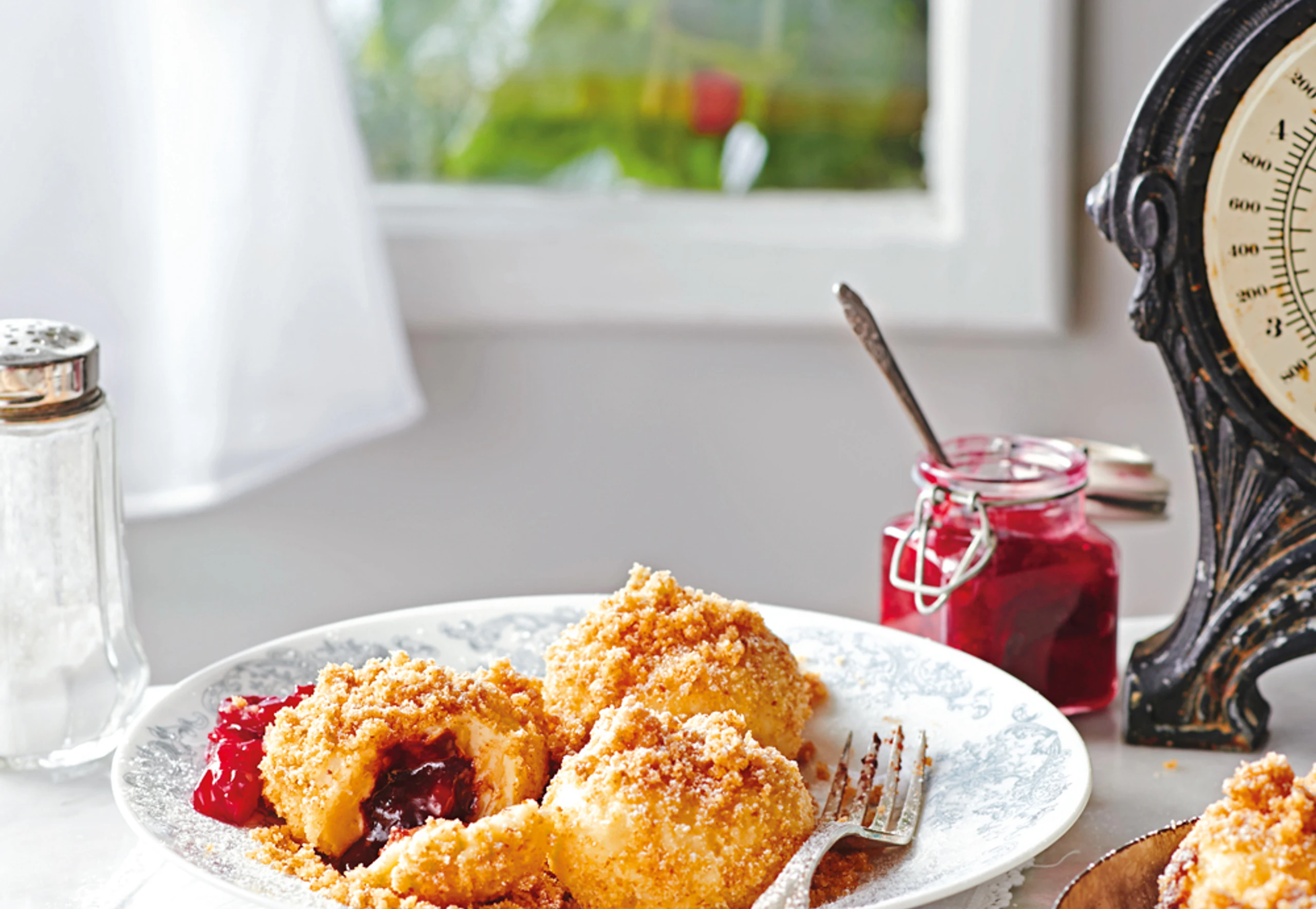 Knödel aus dem Wasser heben und in den Bröseln wälzen. Mit Staubzucker bestreuen und mit dem Kirschröster servieren.
